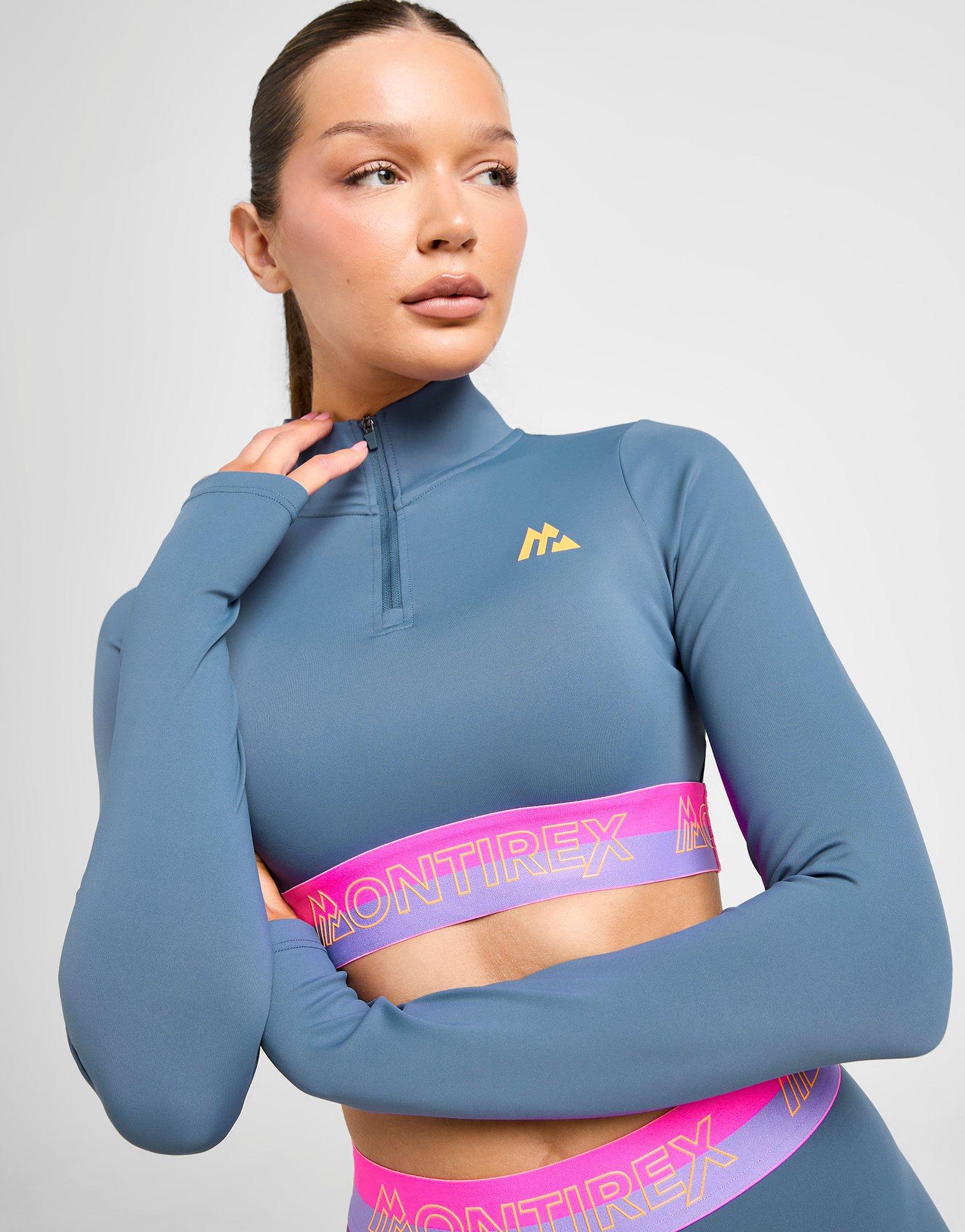 Need an extra layer for workouts? Stay covered from yoga to hikes in this women's Icon Crop 1/4 Zip Top from Montirex. In a Greyed Indigo colourway, this crop-fit top is made from high-stretch polyester that's super smooth for second-skin comfort. It features a quarter zip fastening with a stand-up collar as well as thumb holes in the cuffs to add coverage. Finished with a Fuchsia and Latifolia banded waistband and the signature Montirex logo on the chest. Machine washable. | Our model is 5'10" and wears a size S.
