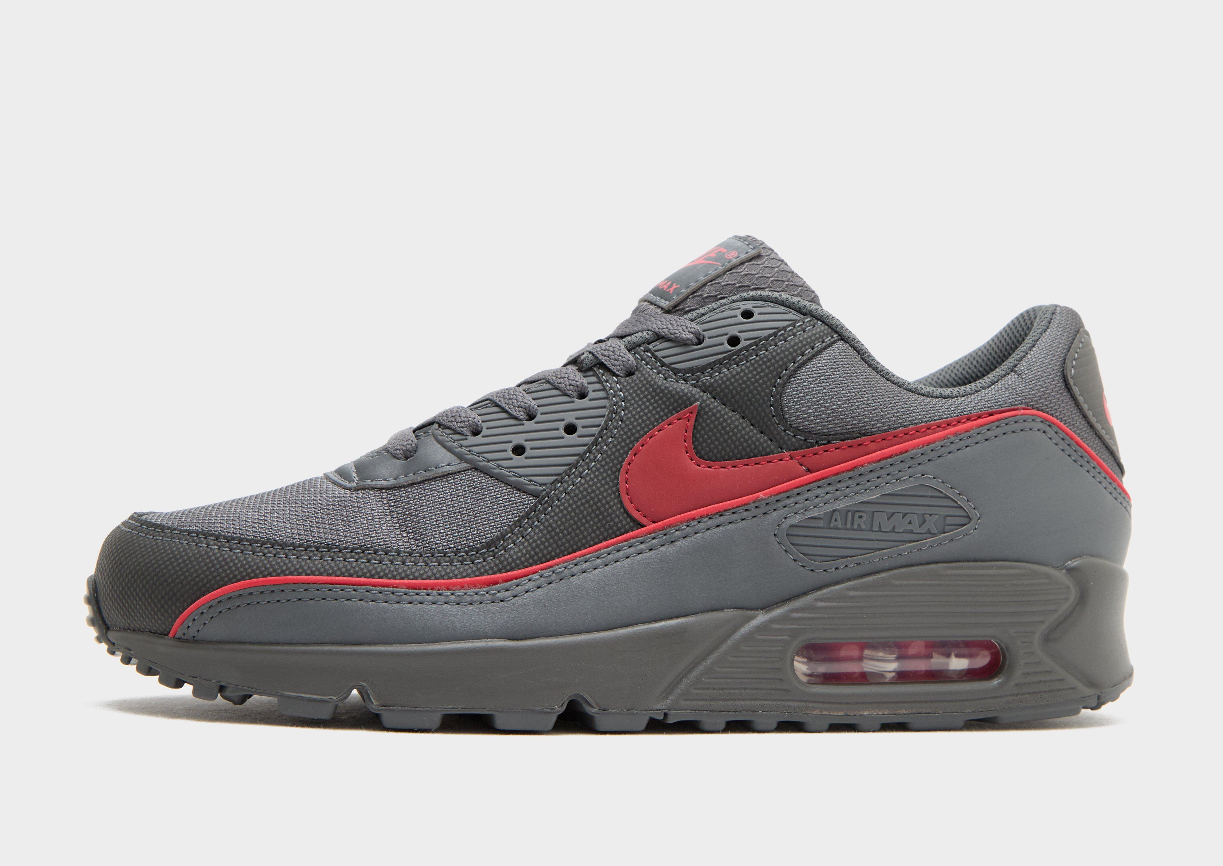 A Swoosh classic. These men's Air Max 90 trainers from Nike land in Iron Grey. Up top, airy mesh links with synthetic overlays. A soft foam midsole and Air cushioning offer next-level comfort. And the rubber Waffle outsole brings grip and heritage vibes. Finished with a University Red Swoosh at the sides.
