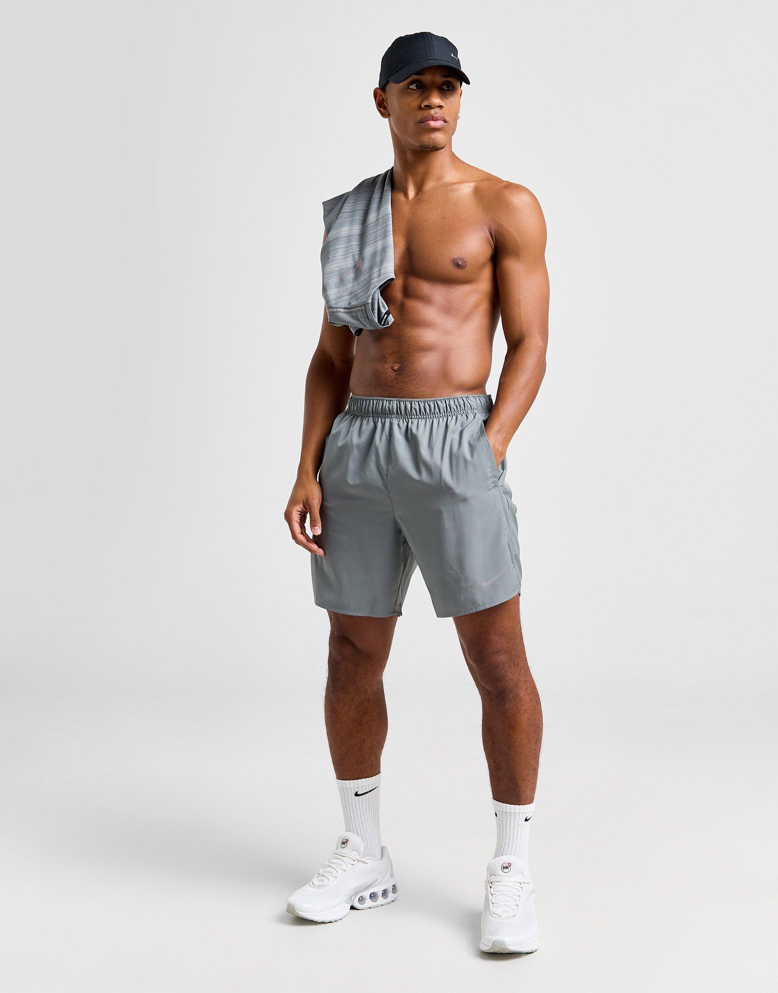 Get your gains in the gym with these men's Challenger 7" Shorts from Nike. In a Smoke Grey colourway, these standard fit shorts are cut from light, breathable polyester fabric for cool comfort. They feature an elasticated waisband for a relaxed fit, with side pockets for your essentials and a stretchy brief lining for a comfy feel. They have built-in Dri-FIT tech and mesh panels to keep you cool and dry and are signed off with signature Swoosh branding to the leg. Machine washable | Our model is 6'0" and wears a size medium.
