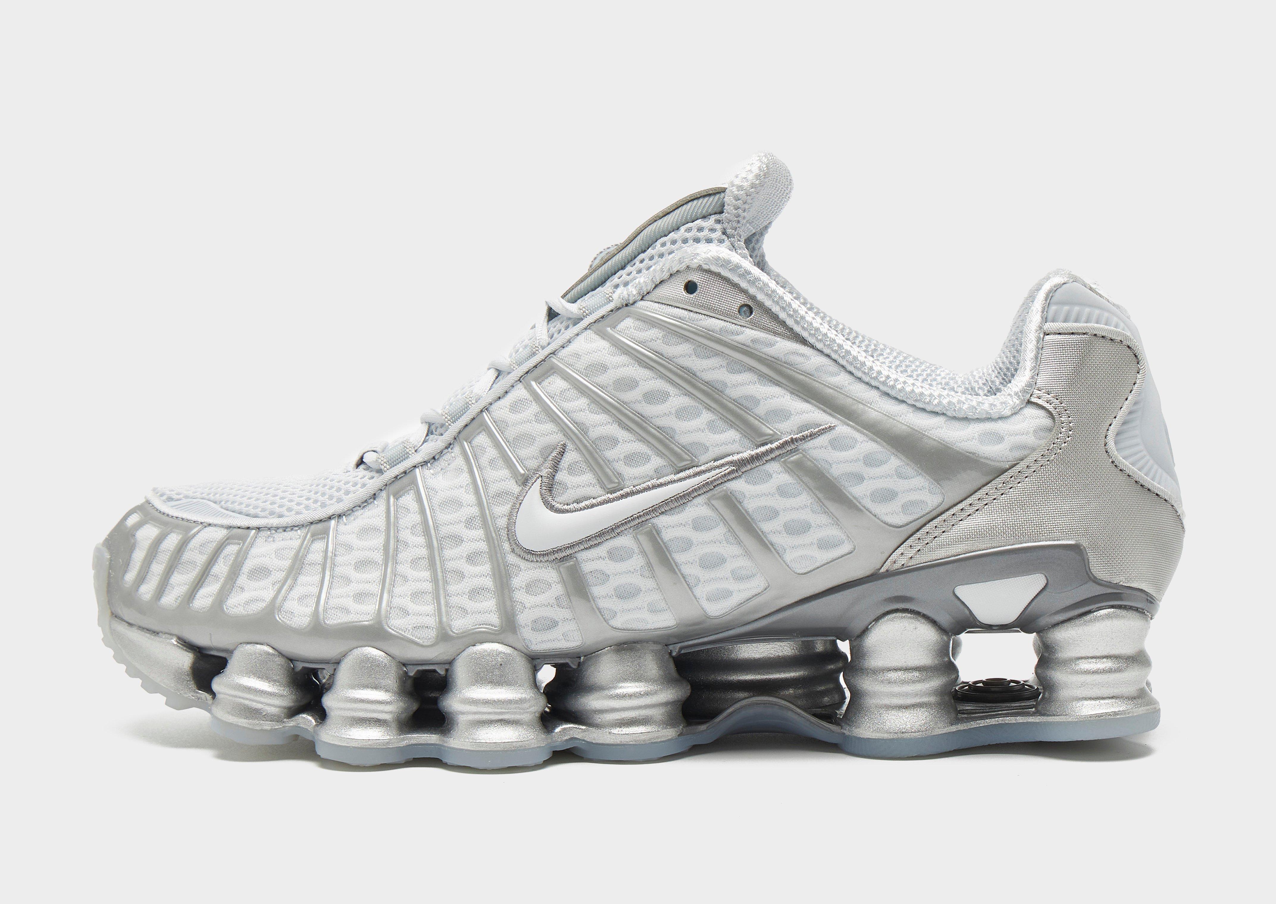Returning in their OG form, these women's Shox TL trainers from Nike bring back the 2003 icon. Fresh and futuristic, they're built with a breathable mesh upper in a Grey and Chrome colourway. These sneakers feature glossy, TPU overlays and a tonal lace-up fastening for a locked-in fit. Underfoot, they're equipped with a full-length Shox midsole with columns of spring-like cushioning for supreme, all-day comfort. With a grippy tread for traction, these trainers are finished with Nike Shox branding to the heel and tongue, as well as a silver-tone Swoosh embroidered to the sidewalls.