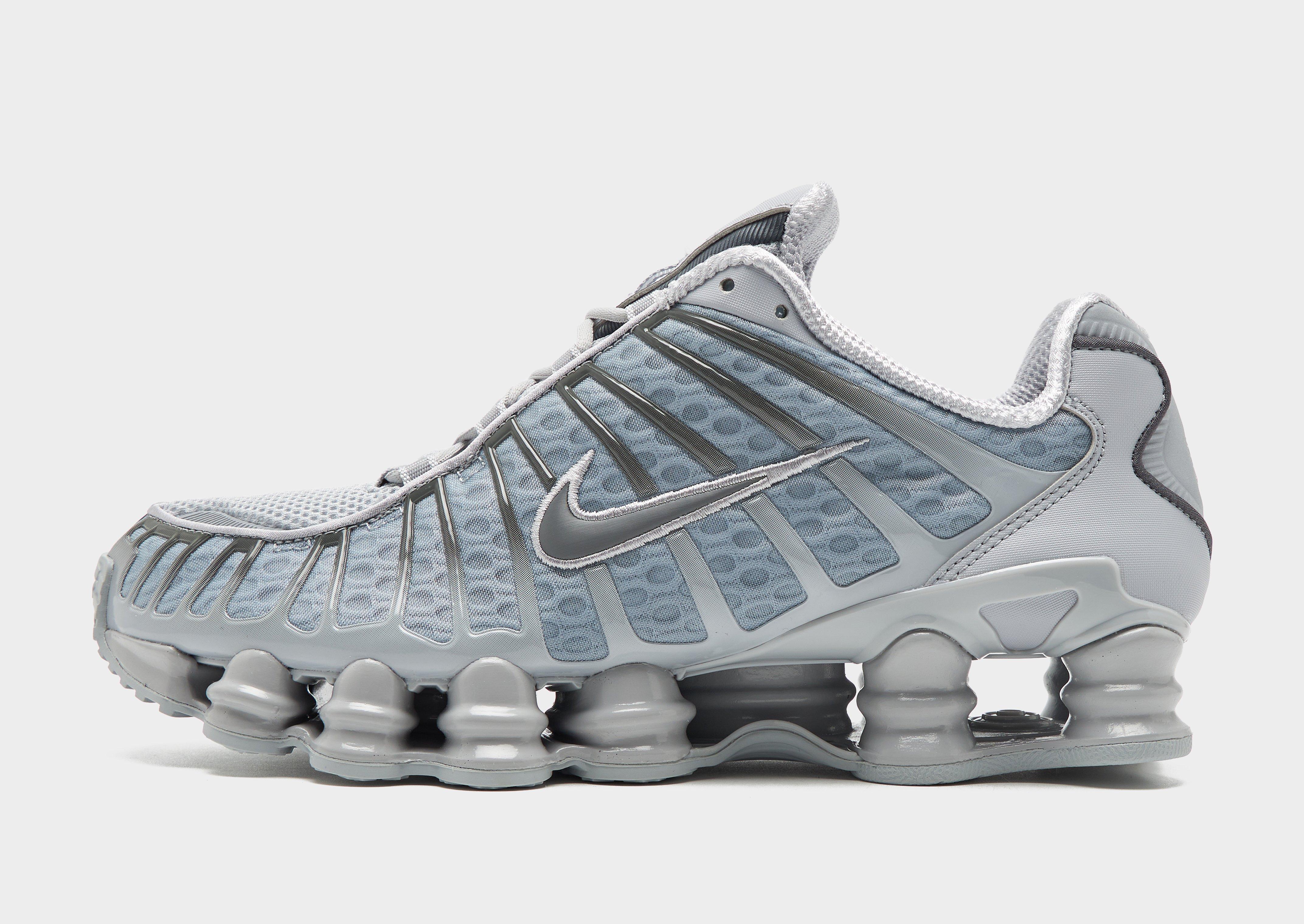 Retro but futuristic, these men's Shox TL sneakers from Nike bring back the 2003 icon in its OG form. In a Grey colourway with tonal details, these statement shoes are built with a breathable mesh upper that features glossy TPU overlays and a tonal lace up fastening for a locked-in fit. Nike's iconic Shox tech sits underfoot, with a full-length midsole of springy Shox columns for a super comfy feel. With a grippy rubber sole, these trainers are finished with Shox branding to the tongue and the signature Swoosh logo embroidered to the sidewalls. Style Code: AV3595-015