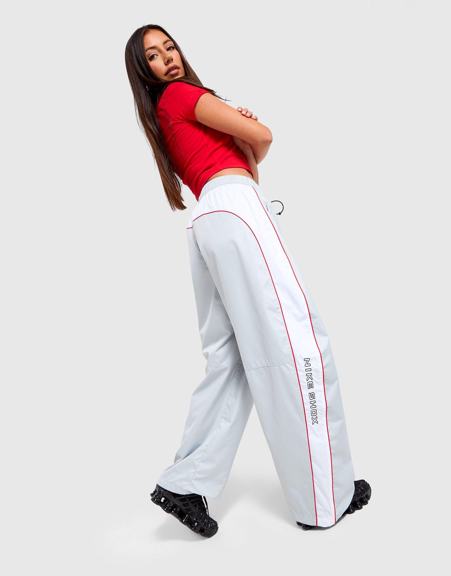 Take on the elements in retro style. These women's Nike Shox Woven Track Pants are light, loose and durable. A low-rise elastic wait features a bungee cord pull to the front. Resistant to wind and water, they're finished off with embroidered Swoosh and Nike Shox logos. Machine washable. | Our model is 5'8" and wears a size S.