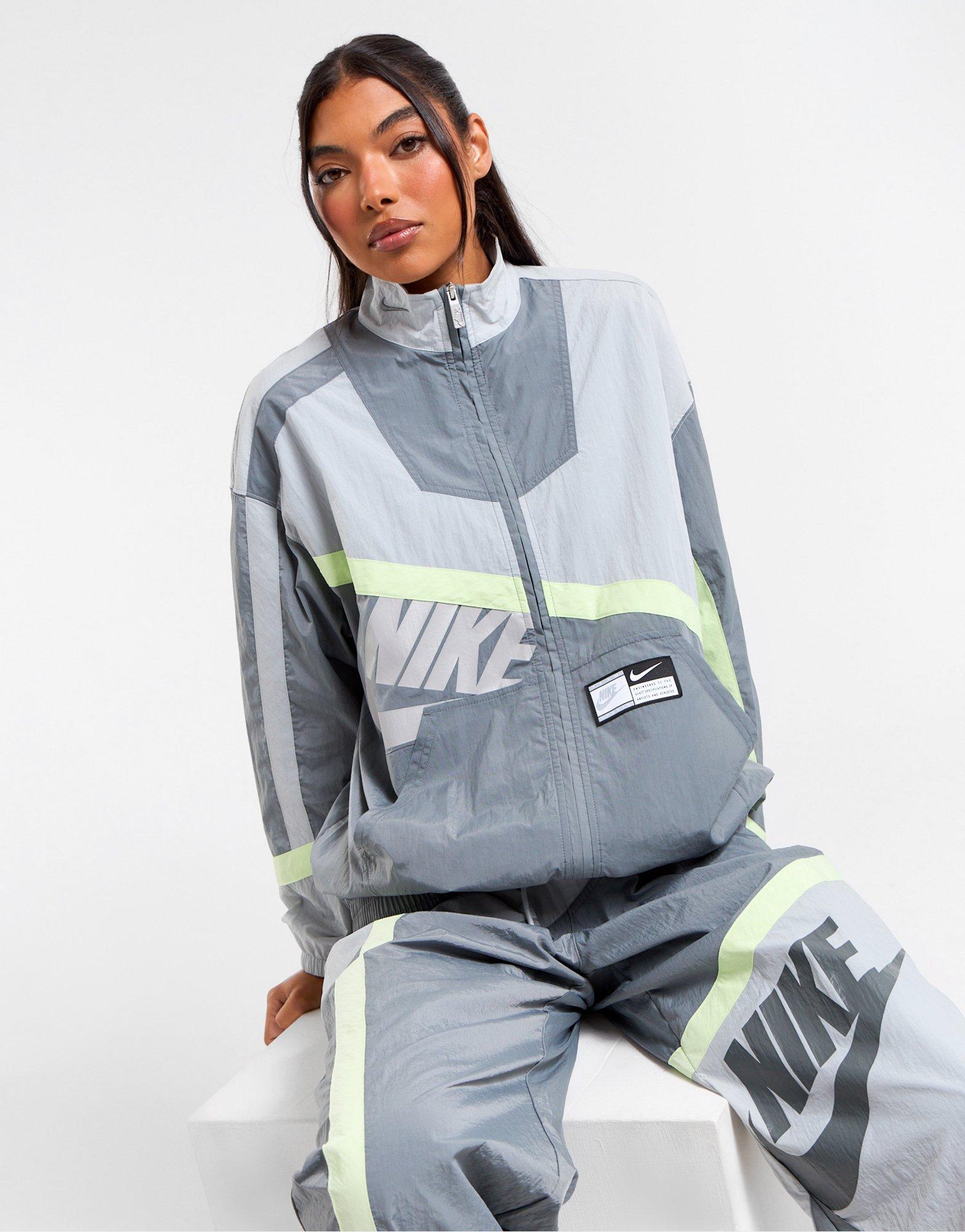Bring a retro vibe to your 'fits with this women's Street Woven Jacket from Nike. In a Smoke Grey colourway, this oversized jacket is made with smooth, lightweight woven fabric for lasting comfort. With a water-repellent finish for extra protection against the elements, it features a full-zip fastening with a funnel collar for coverage, and elasticated trims to secure the shape. With front pockets for quick storage, it's finished with bold Nike branding throughout.