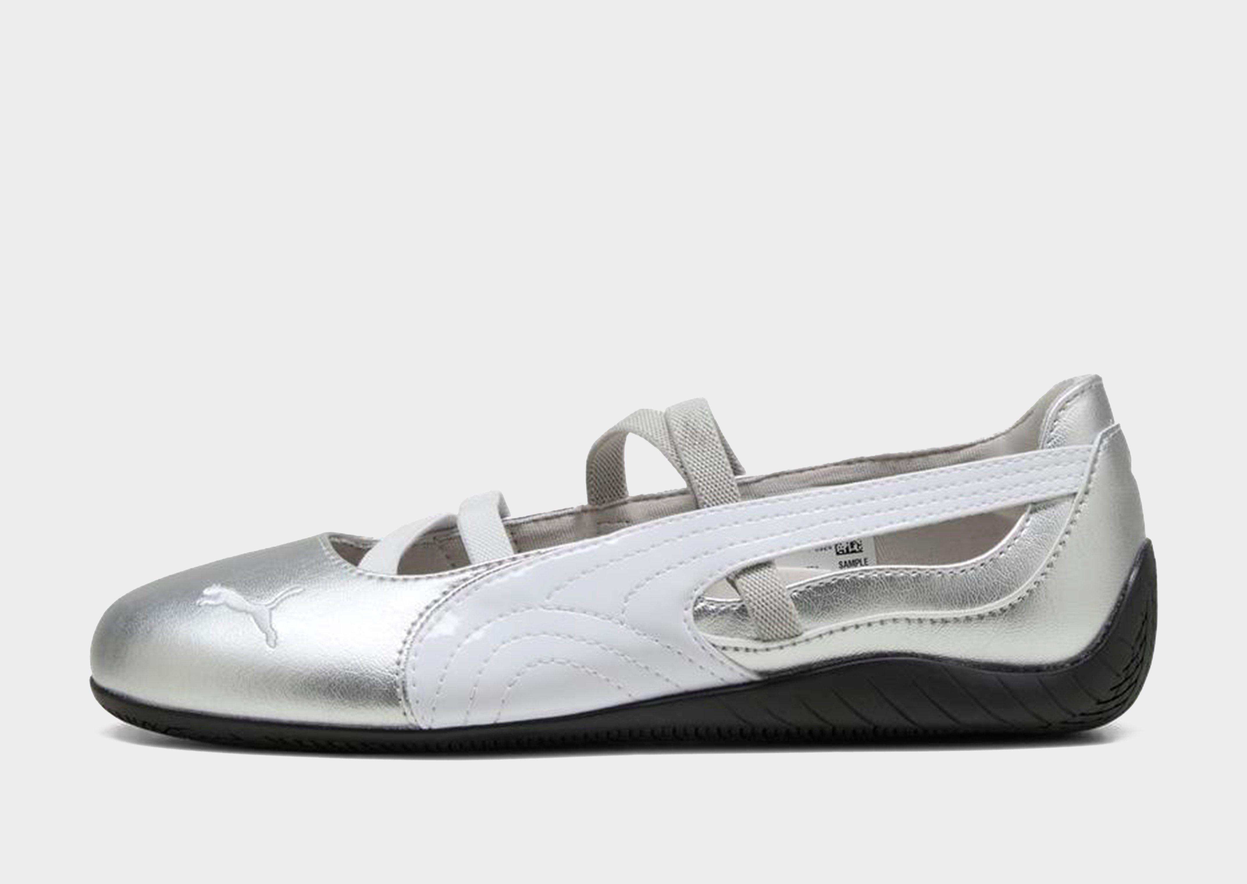 The iconic Speedcat sneaker returns in a low-profile form with the women's Speedcat Ballet from Puma. Landing in a metallic Sliver colourway, its low profile silhouette is paired with sleek details inspired by motorsport racing. This 'sneakerina' combines the sporty sole and comfort of a sneaker with the delicate upper of a ballet flat. The shoe's popularity has taken it from motor racing to the fashion world, with its vibrant colours and easy to wear design making it a must-have staple for your sneaker rotation. Crafted from a Suede upper for an elevated look, a rubber outsole underneath provides traction, and rubber bands over the foot for a locked-in feel. Finished off with the signature PUMA formstrip to the sidewalls, and the iconic PUMA silhouette embroidered to the toebox. Style Code: 40158101