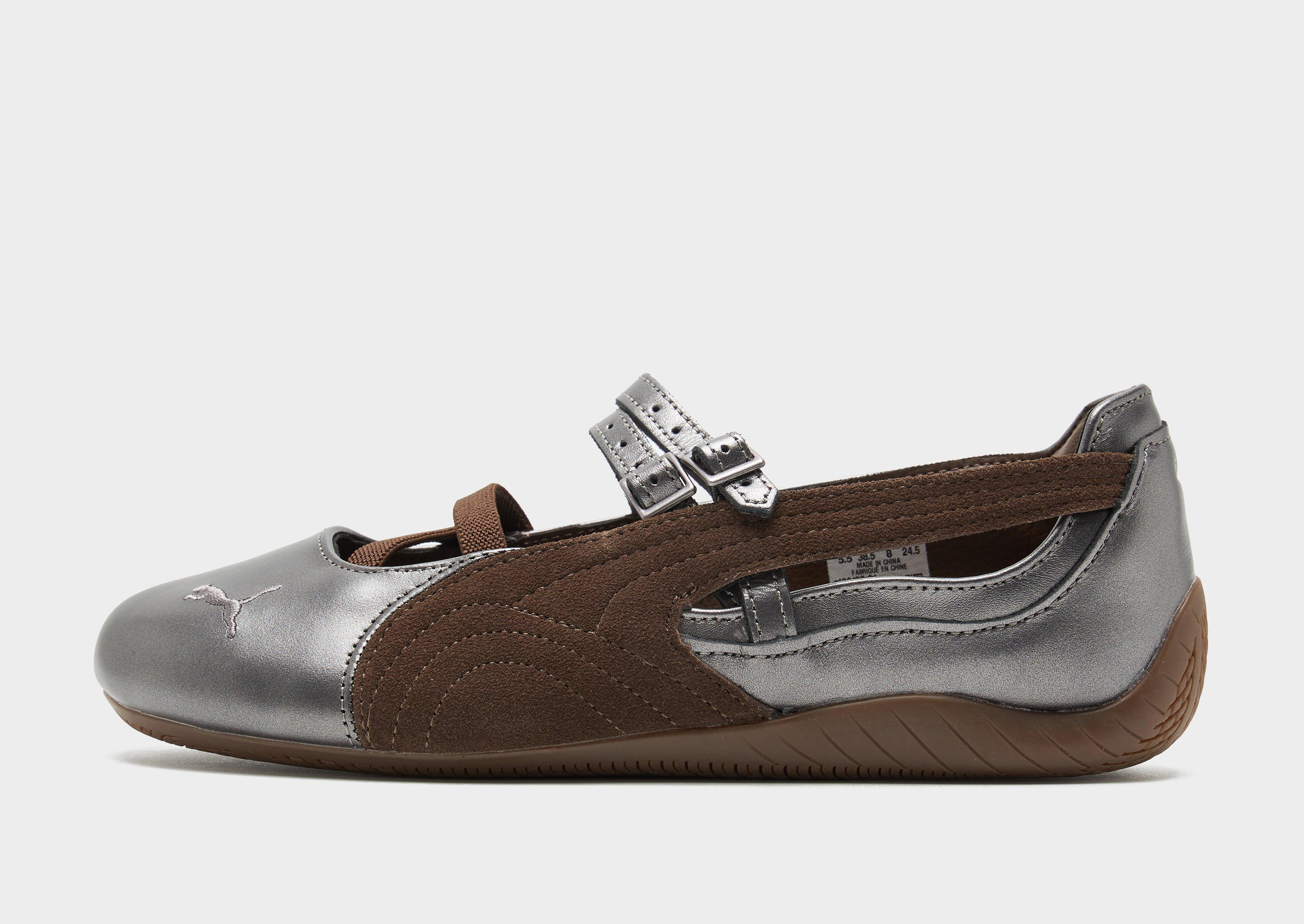 The iconic Speedcat sneaker returns in a low-profile form with the women's Speedcat Ballet from Puma. Landing in a Silver colourway with Brown details, this sneakerina has a low profile silhouette paired with sleek details inspired by motorsport racing. The shoe's popularity has taken it from motor racing to the fashion world, with its vibrant colours and easy to wear design making it a must-have staple for your sneaker rotation. Crafted from a Suede upper for an elevated look, a rubber outsole underneath provides traction, and adjustabe bands over the foot for a locked-in feel. Finished off with the signature PUMA formstrip to the sidewalls, and the iconic PUMA silhouette embroidered to the toebox.