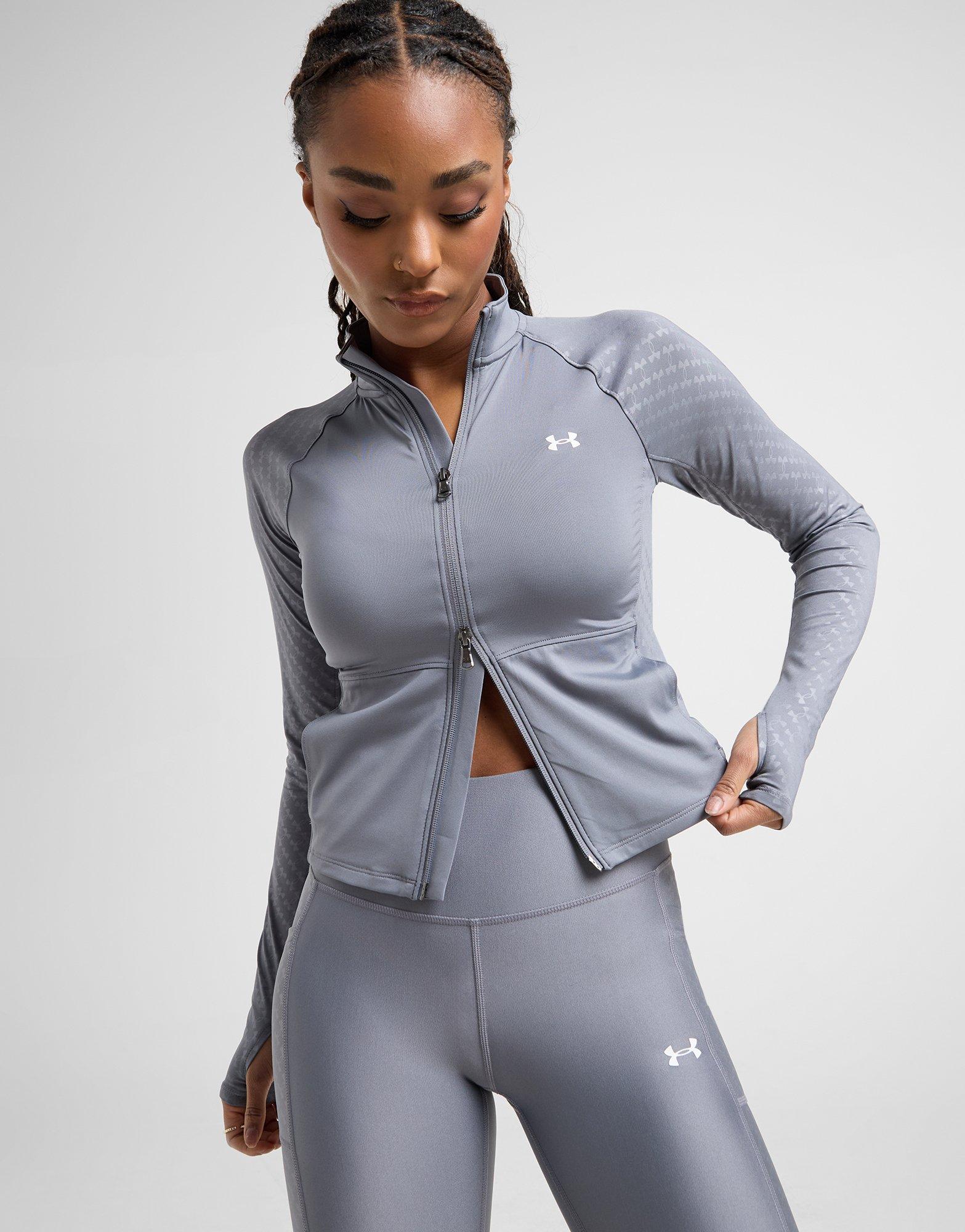 Exclusive to JD. Elevate your performance with this women's Emblem All Over Print Full Zip Top from Under Armour. In a Grey colourway, this top is made from smooth, stretchy poly fabric for total comfort as you put in the work. It features a full-zip fastening and a stand-up collar to amp up the coverage, with thumbholes on the cuffs to hold 'em in place. With a tonal print down the sleeves, it's signed off with wordmark branding to the nape and the Under Armour logo on the chest. Machine washable. | Our model is 5'7" and wears a size S.