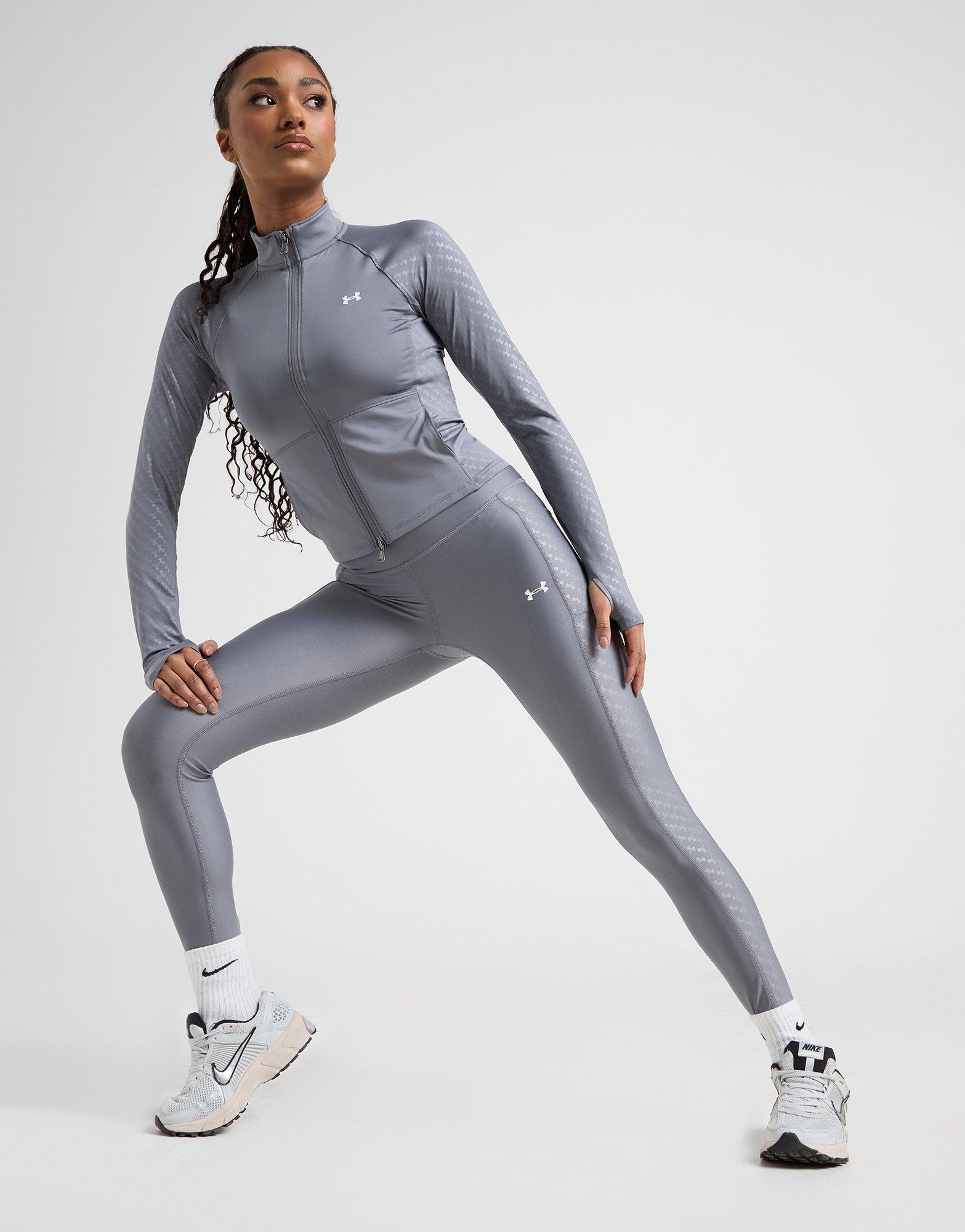 Level up your training rotation with these women's Emboss All Over Print Leggings from Under Armour. In a Grey colourway, these JD-exclusive leggings are made with smooth, sweat-wicking poly fabric for total comfort as you put in the work. They feature an elasticated waistband for a secure fit, with side pockets to stash away your essentials. Finished up with an all-over print and the Under Armour logo on the left thigh. Machine washable. | Our model is 5'7" and wears a size S.