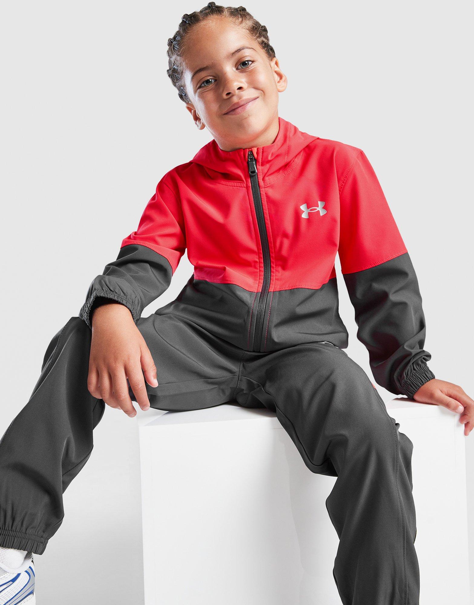 Active? Always. This children's Vanish Colour Block Woven Tracksuit from Under Armour. In a red and grey combo, this set's cut from lightweight woven fabric. It's got a zipped hoodie and track pants for a complete fit, with elastic trims to hold it in place. Finished with Under Armour branding. Machine washable.