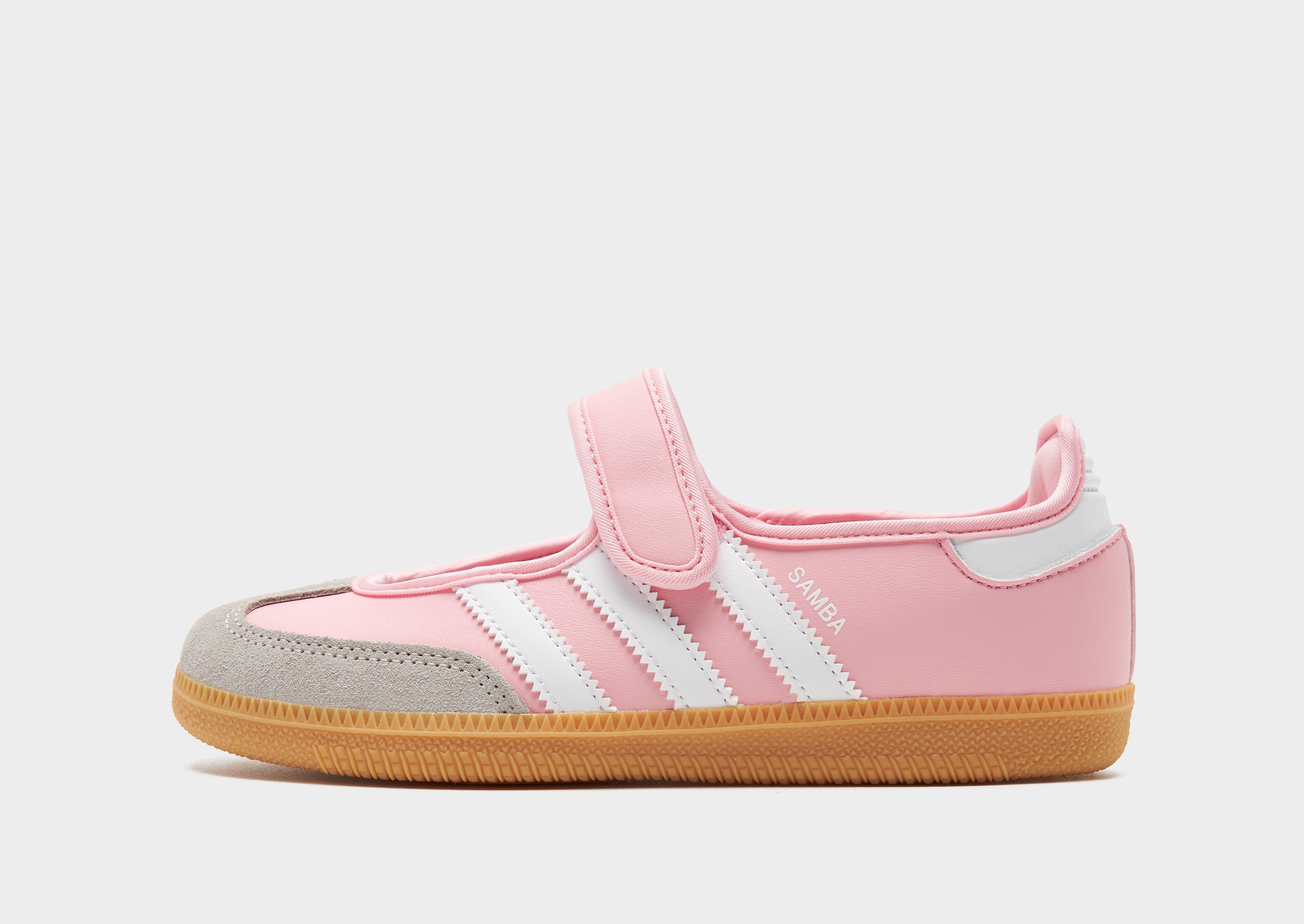 The Adidas Samba Jane brings that Mary Jane energy to the iconic terrace classic you already know and love. Designed with kids' and parents' needs in mind, they feature a wide open instep design, making them easy to put on and take off, featuring slip-on construction and hook-and-loop closure for easy dressing. This 'sneakerina' combines the sporty sole and comfort of a sneaker with the delicate upper of a ballet flat.