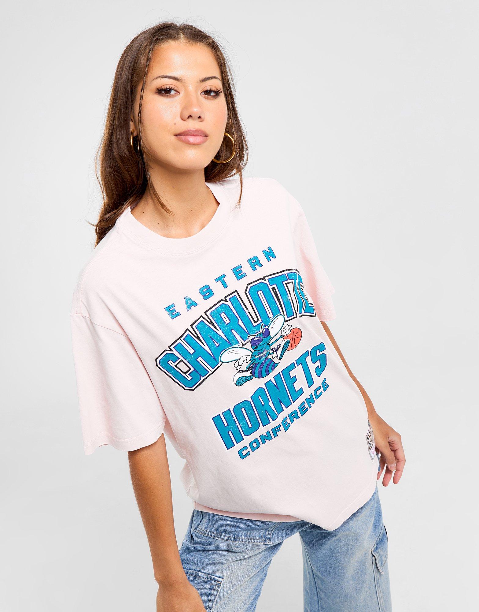 Channel throwback court vibes, even when you're off-duty, with this women's NBA Charlotte Hornets T-Shirt from Mitchell & Ness. Mitchell & Ness, a Philadelphia-born sportswear brand since 1904, epitomizes authenticity and nostalgia, crafting premium, vintage-inspired apparel that pays homage to iconic moments in sports history.