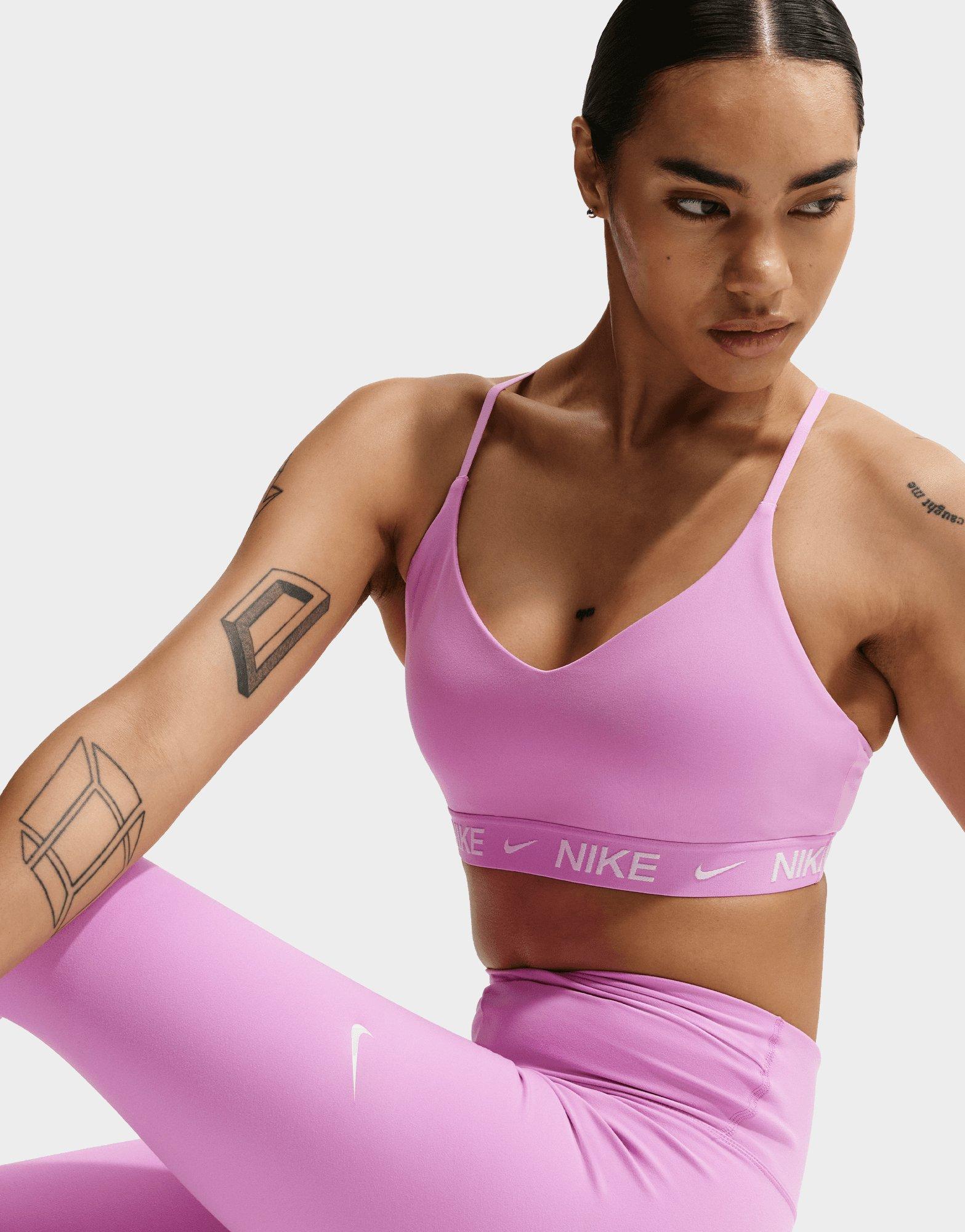 Support your workout with this women's Nike Indy V-Neck Sports Bra, designed for light-support activities. Standard fit provides comfortable coverage for yoga, Pilates, or low-impact training. Pink colourway with white accents brings fresh femininity to your activewear rotation. Breathable construction ensures all-day comfort. Style Code: FD1062-503
