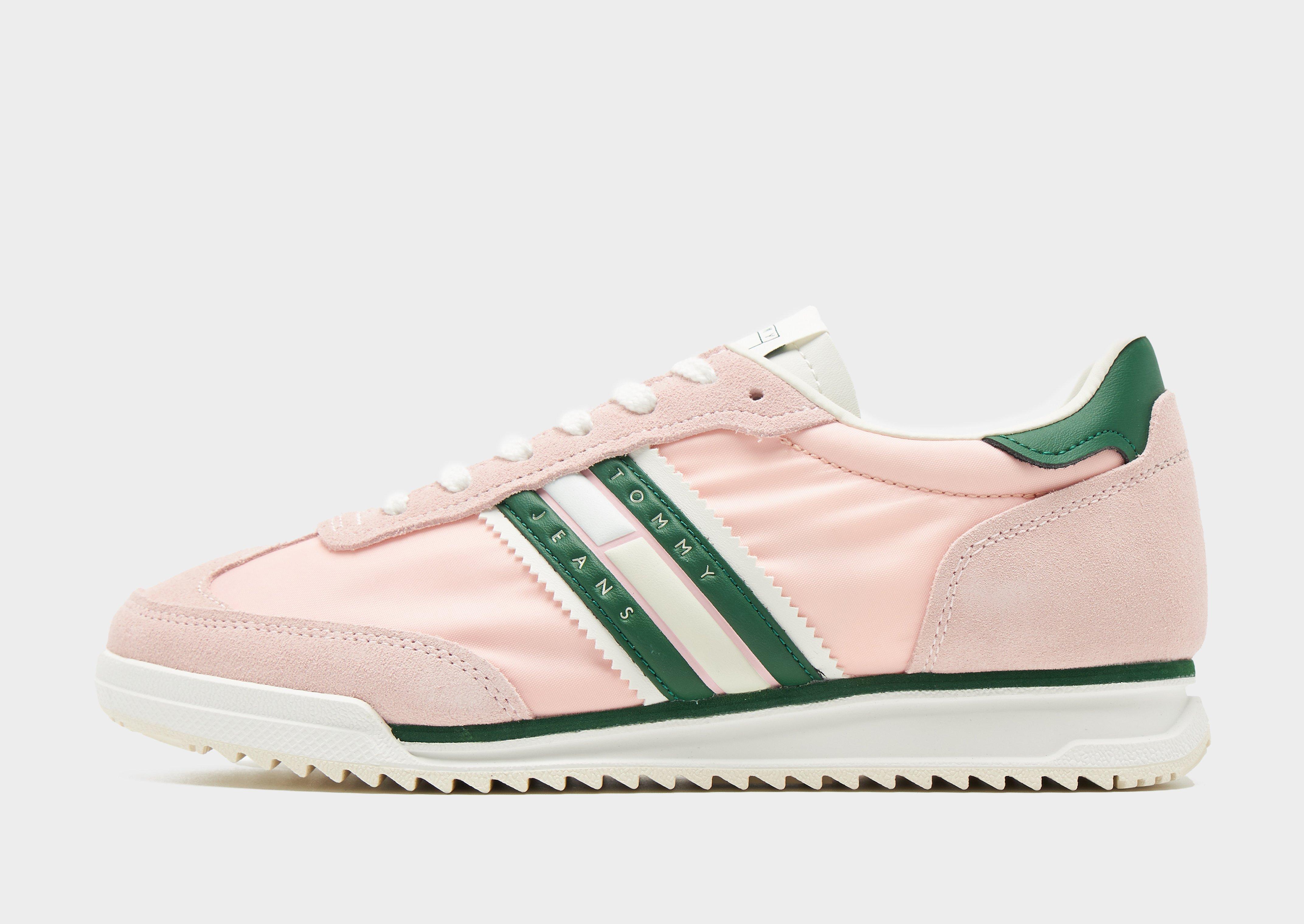 Step out in retro-inspired runners with these women's Alphacleat shoes from Tommy Hilfiger. Coming in a Pink colourway with Green details, these sneakers have a durable leather upper with soft suede overlays for a premium feel. The foam midsole provides all-day comfort, while a tough rubber outsole delivers grippy traction. Finished with signature Tommy branding throughout. Style Code: EN0EN02717TIO