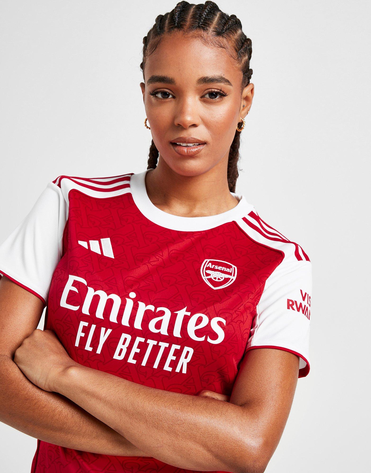 Bring classic Gunners style back with this women's Arsenal FC 2025/26 Home Shirt from adidas. In a Better Scarlet colourway with a White crew neckline and short sleeves, this stadium shirt has a Gothic style A print to the front and back that's inspired by old-school Arsenal branding. The shirt is made from smooth recycled polyester, with sweat-wicking AEROREADY tech and mesh inserts delivering cool comfort. Finished off with the 3-Stripes down the shoulders and the Performance logo and Arsenal crest on the chest. Machine washable. | JI9532