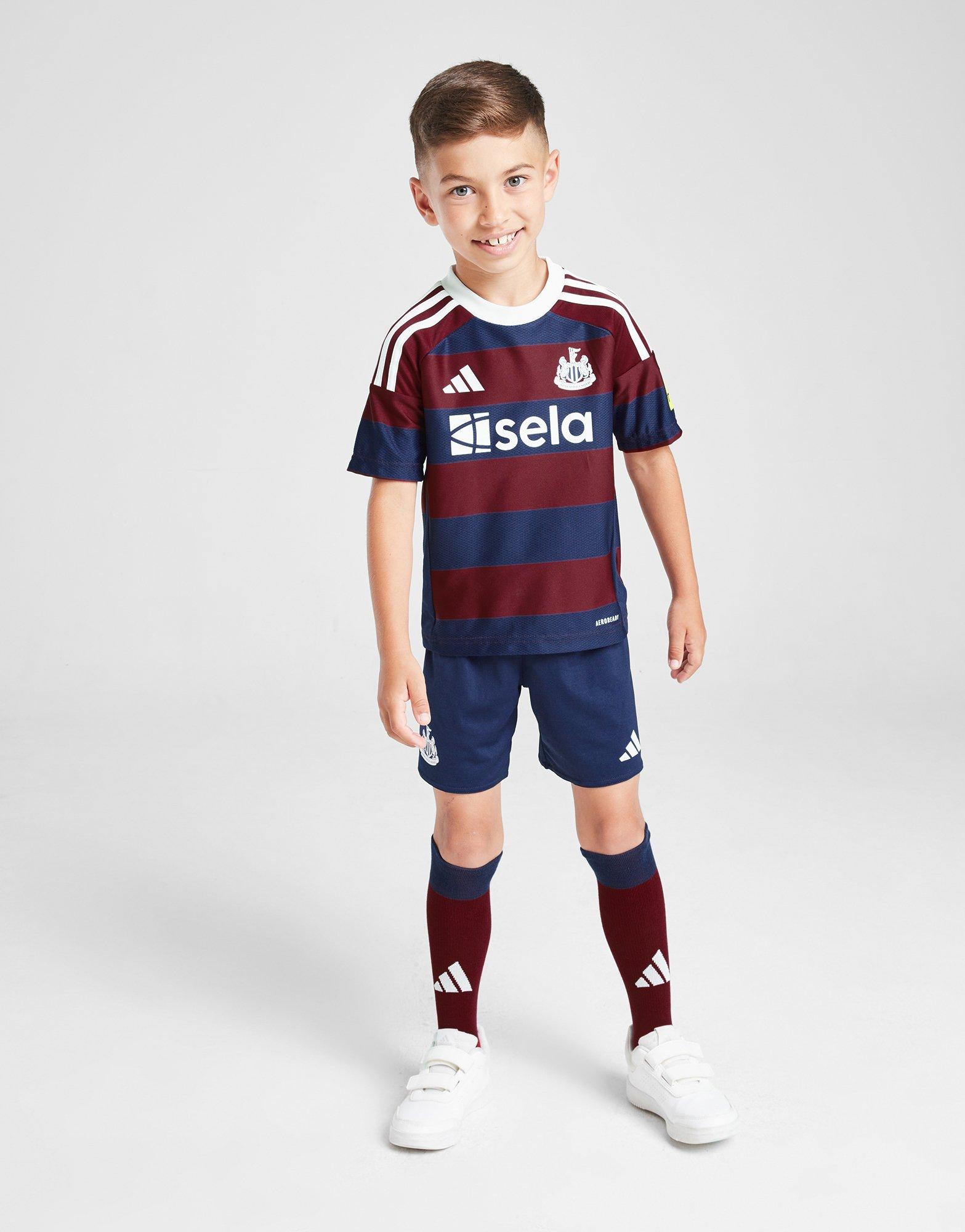 Get the smallest supporters backing the Magpies with this children's Newcastle United FC 2024/25 Away Kit from adidas. Inspired by what the pros wear, this kit is made with smooth, lightweight recycled polyknit fabric for breathable comfort. It's crafted with sweat-wicking AEROREADYt technology, and features a short-sleeve shirt with a crew neckline and short sleeves, coming in a Team Collegiate Burgundy and Night Sky colourway. The matching shorts have an elasticated waistband with a drawcord for a snug, secure fit. Finished with adidas branding throughout, and the iconic Newcastle United FC team badge to sign off. Machine washable. | IW0379