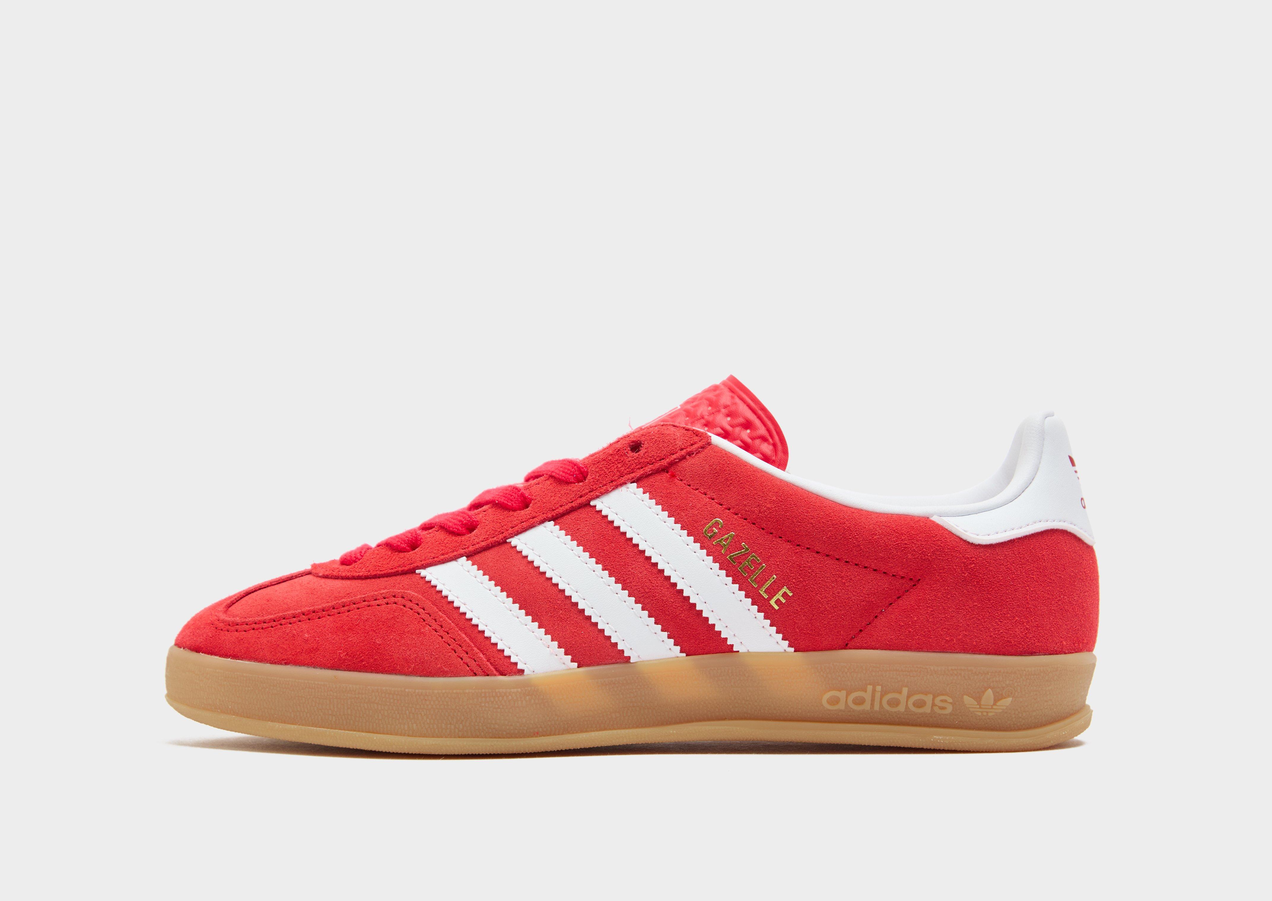 Put a terrace classic in your rotation with these juniors' Gazelle Indoor trainers from adidas Originals. In a Better Scarlet colourway, these low-top creps have a smooth cow suede and synthetic leather upper, with a cushioned insole and collar for a comfy fit. The translucent Gum 2 rubber outsole delivers retro style and grip. Finished with White serrated 3-Stripes, the Trefoil logo and Gold foil Spezial branding. | JS3801