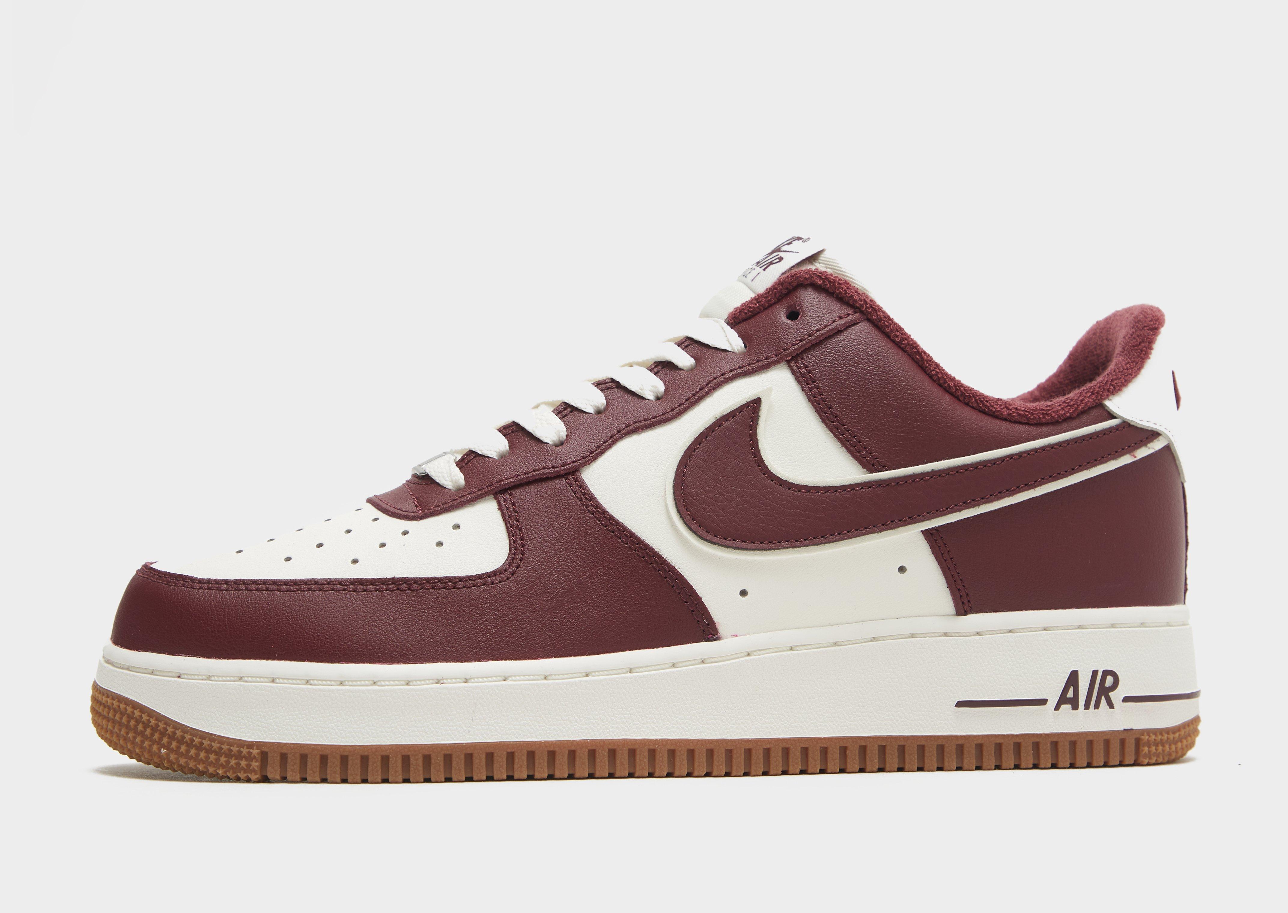 A Swoosh icon gets a refresh with these men's Air Force 1 '07 LV8 trainers from Nike. In a Sail and Night Maroon colourway, these court-inspired classics have a premium leather upper, with breathable perforations for cool comfort. They have cosy knit tongue and a soft, fleecy lining for added warmth, while the low-cut, padded ankle collar offers a plush fit. Underfoot, the chunky midsole uses Nike Air cushioning for a lightweight ride, while the Gum Medium Brown rubber outsole adds heritage style and standout grip. Finished off with the legendary Swoosh to the sidewalls.