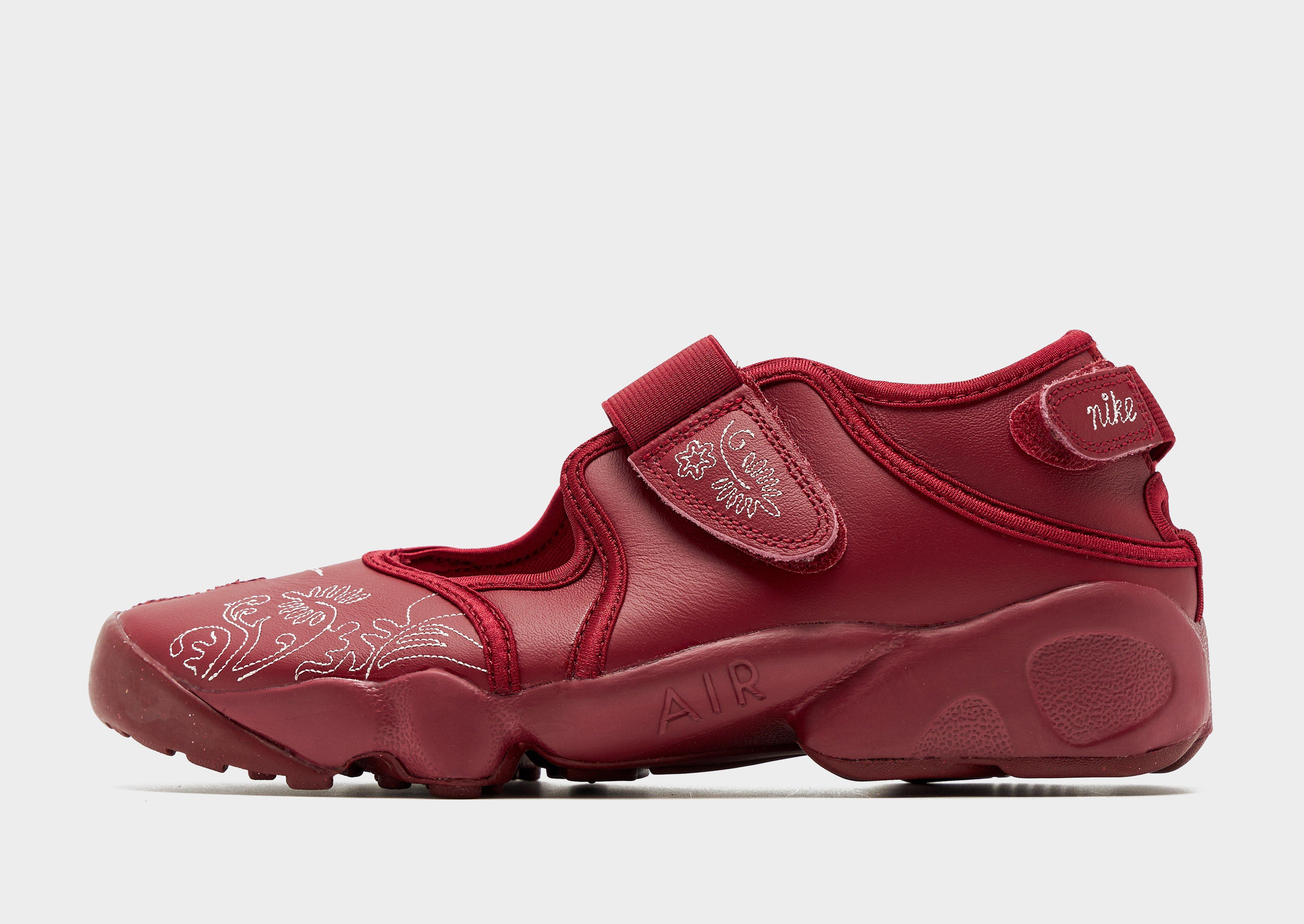 This Air Rift model features a smooth, full-grain leather upper with hook-and-loop straps for easy adjusting. The split-toe design brings stability and comfort to every step while embroidered details add a playful aesthetic to your look. And because you deserve a little R&R, there's an added plush foam midsole with Air cushioning in the heel to put your feet in holiday mode. Style Code: IH7318-677