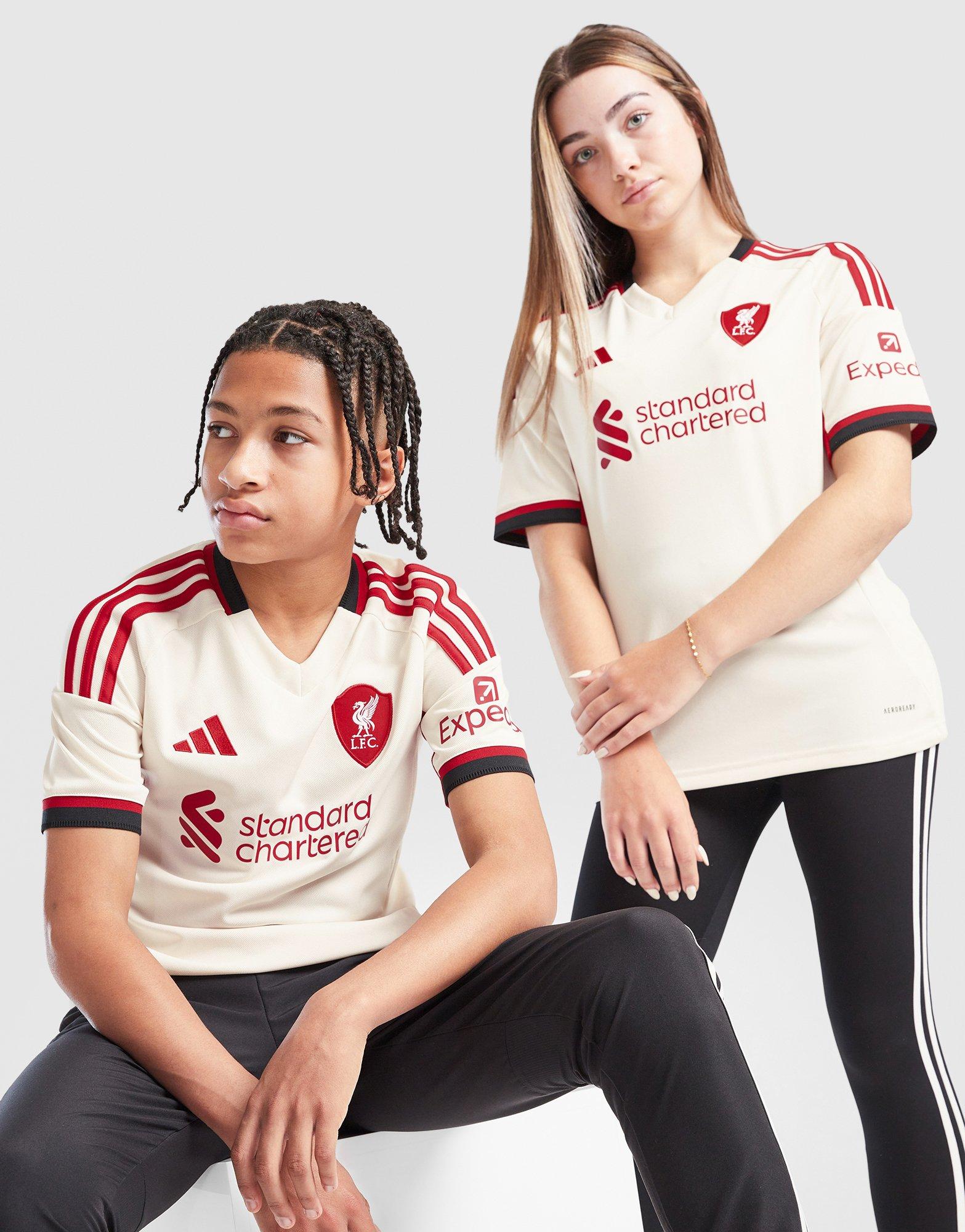 Liverpool are back in the 3-Stripes. Teaming up with adidas again, this juniors' Liverpool FC 2025/26 Away Shirt pays tribute to Anfield. The Wonder White and red combo features a V-neckline and short sleeves. Recycled polyester is packed with mesh inserts and sweat-wicking AEROREADY tech for cool comfort. With the Performance logo on one side, the Liverpool crest on the other takes cues from the old Main Stand. Machine washable. | JV6453