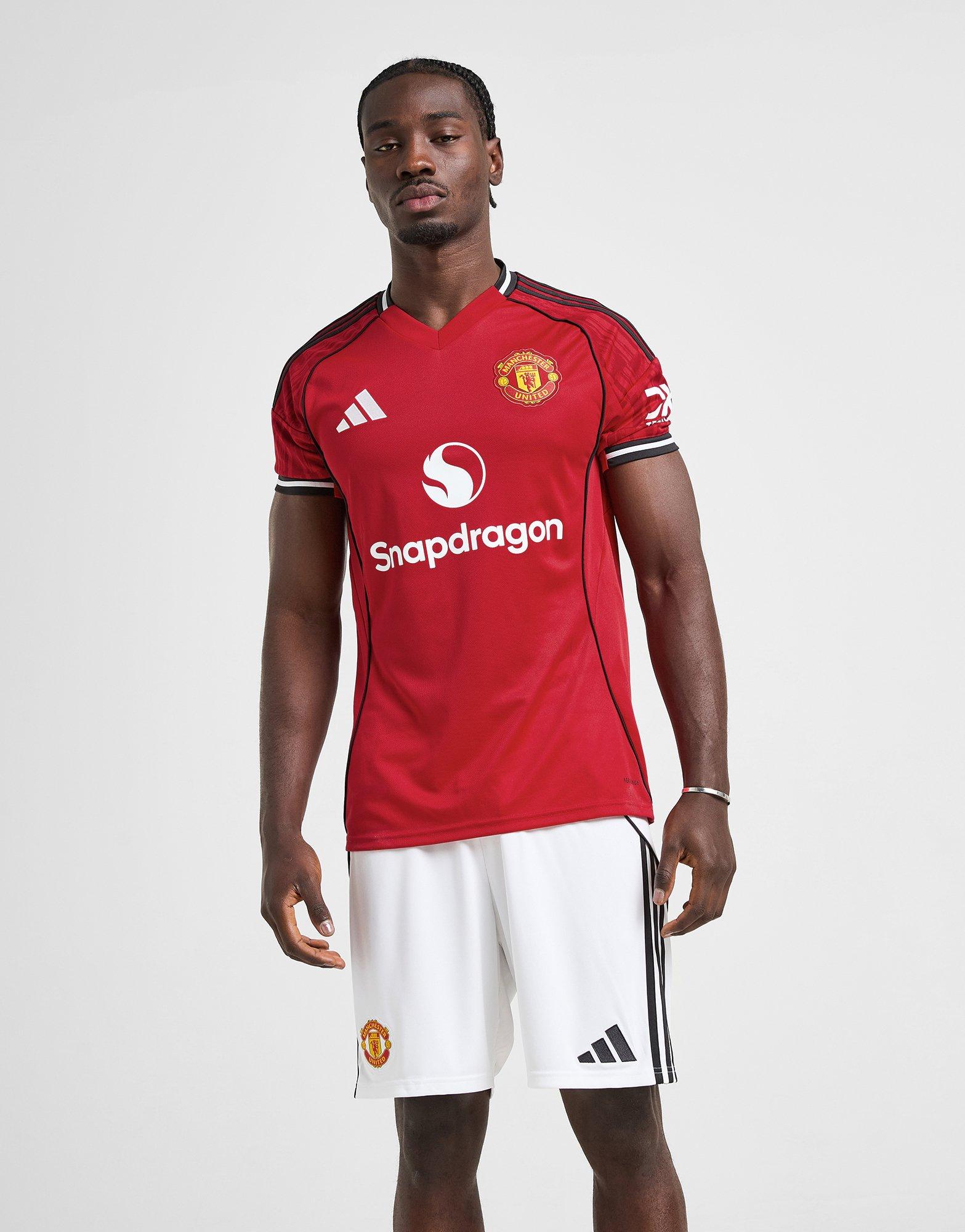 Hit the pitch repping the Red Devils with these men's Manchester United FC 2025/26 Home Shorts from adidas. In White, these regular-fit shorts are made from recycled polyester that's lightweight and comfy. Sweat-wicking AEROREADY tech keeps you cool when the game heats up, while the elastic waistband has a drawcord tie to secure them in place. Finished off with adidas Performance logo and an embroiderd Man United badge. Machine washable. | JI7430