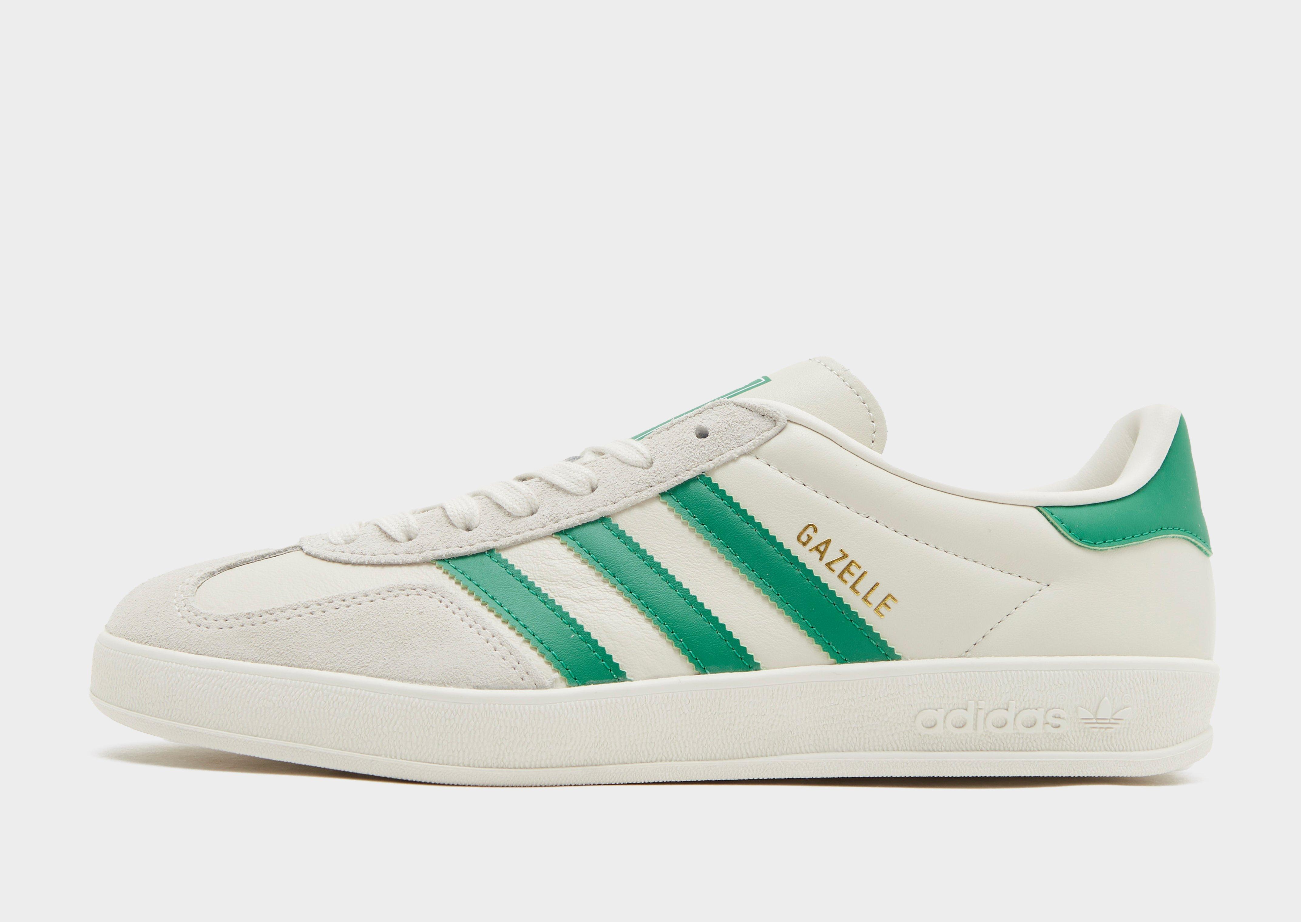 Lace up in a classic style with these men's Gazelle Indoor trainers from adidas Originals. In a Chalk White colourway with Green accents, these kicks have a real and synthetic leather upper for lasting wear. With the iconic T-toe cap, they feature a lace-up fastening with soft padding around the collar to lock you in, and lightweight cushioning underfoot for all-day comfort. With a tough rubber tread for traction, they're finished with signature adidas Originals branding throughout. | JH5409