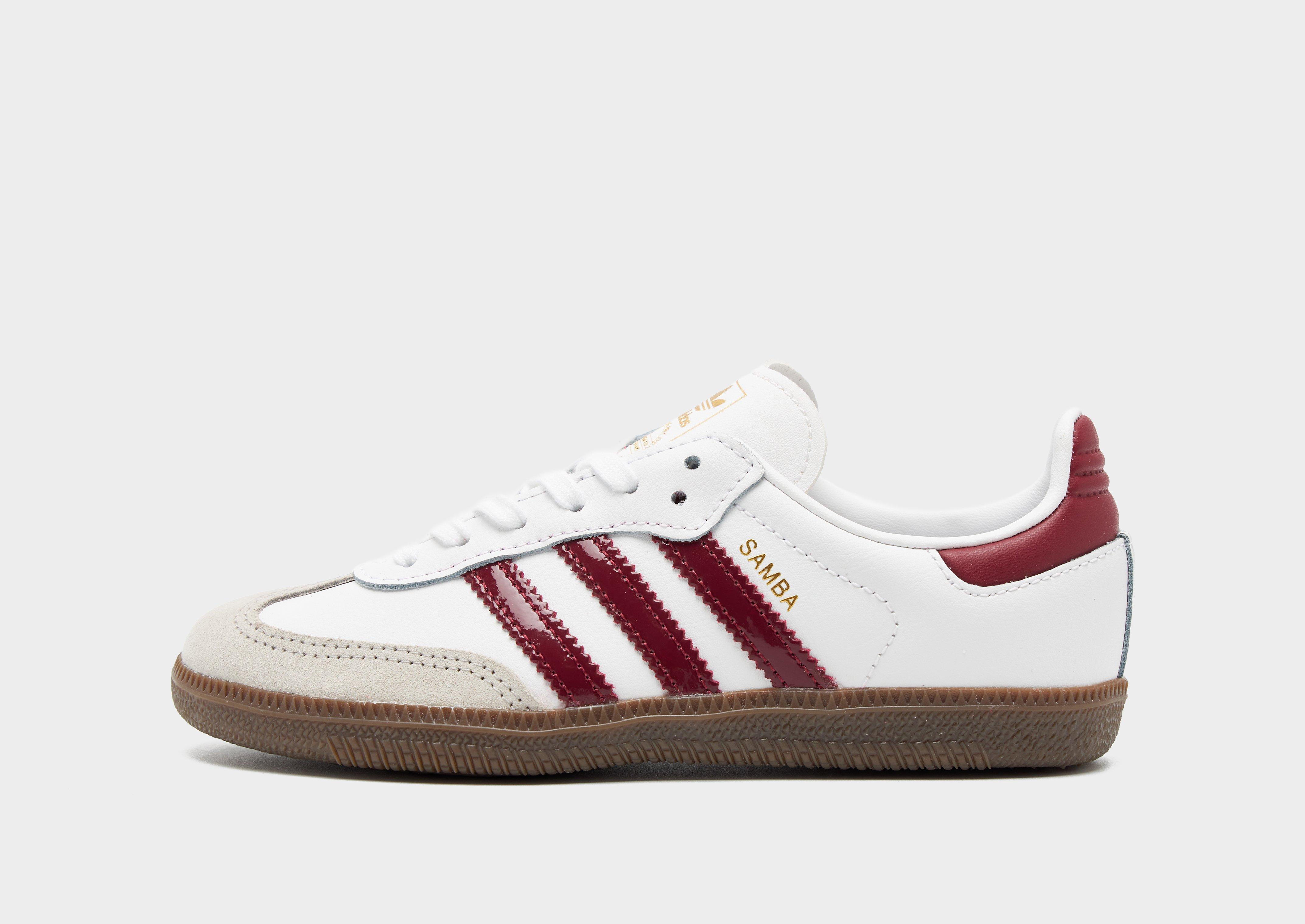 Add a streetwear icon to your footwear rotation with these children's Samba OG shoes from adidas Originals, exclusive to JD. Taking cues from the original football-inspired Samba design first introduced in the 1950s, these iconic terrace sneakers let you imagine you're walking in those vintage footsteps. Built with a White leather upper, they feature a suede toe guard and are sat upon a responsive gum midsole. With tonal laces and signature adi 3-stripes to the side in Burgundy Red, they're signed off with 'Samba' wording to the side, and iconic Trefoil branding to the tongue. Style Code: HQ5004