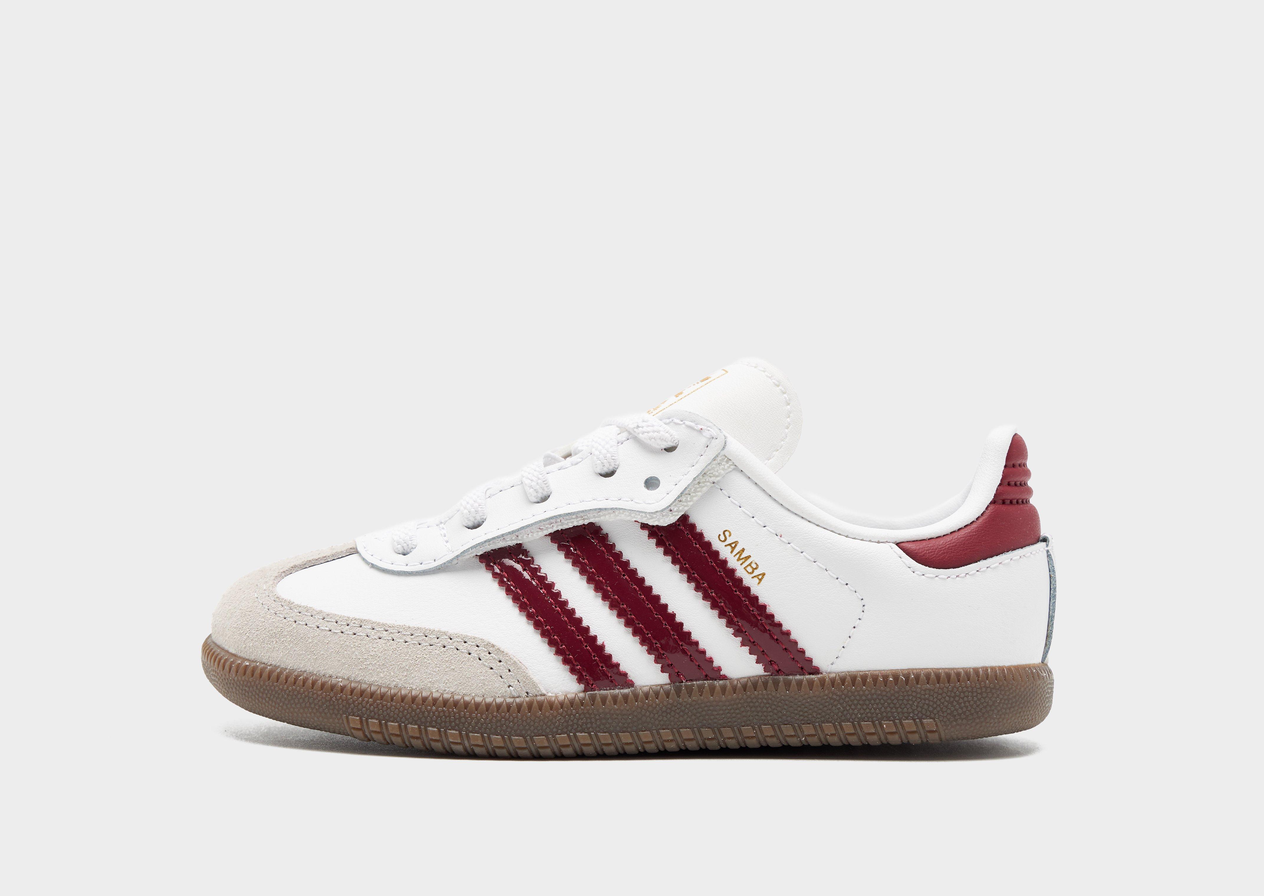 Add a streetwear icon to your footwear rotation with these infant's Samba OG shoes from adidas Originals, exclusive to JD. Taking cues from the original football-inspired Samba design first introduced in the 1950s, these iconic terrace sneakers let you imagine you're walking in those vintage footsteps. Built with a White leather upper, they feature a suede toe guard and are sat upon a responsive gum midsole. With tonal laces and signature adi 3-stripes to the side in Burgundy Red, they're signed off with 'Samba' wording to the side, and iconic Trefoil branding to the tongue. Style Code: HQ5005