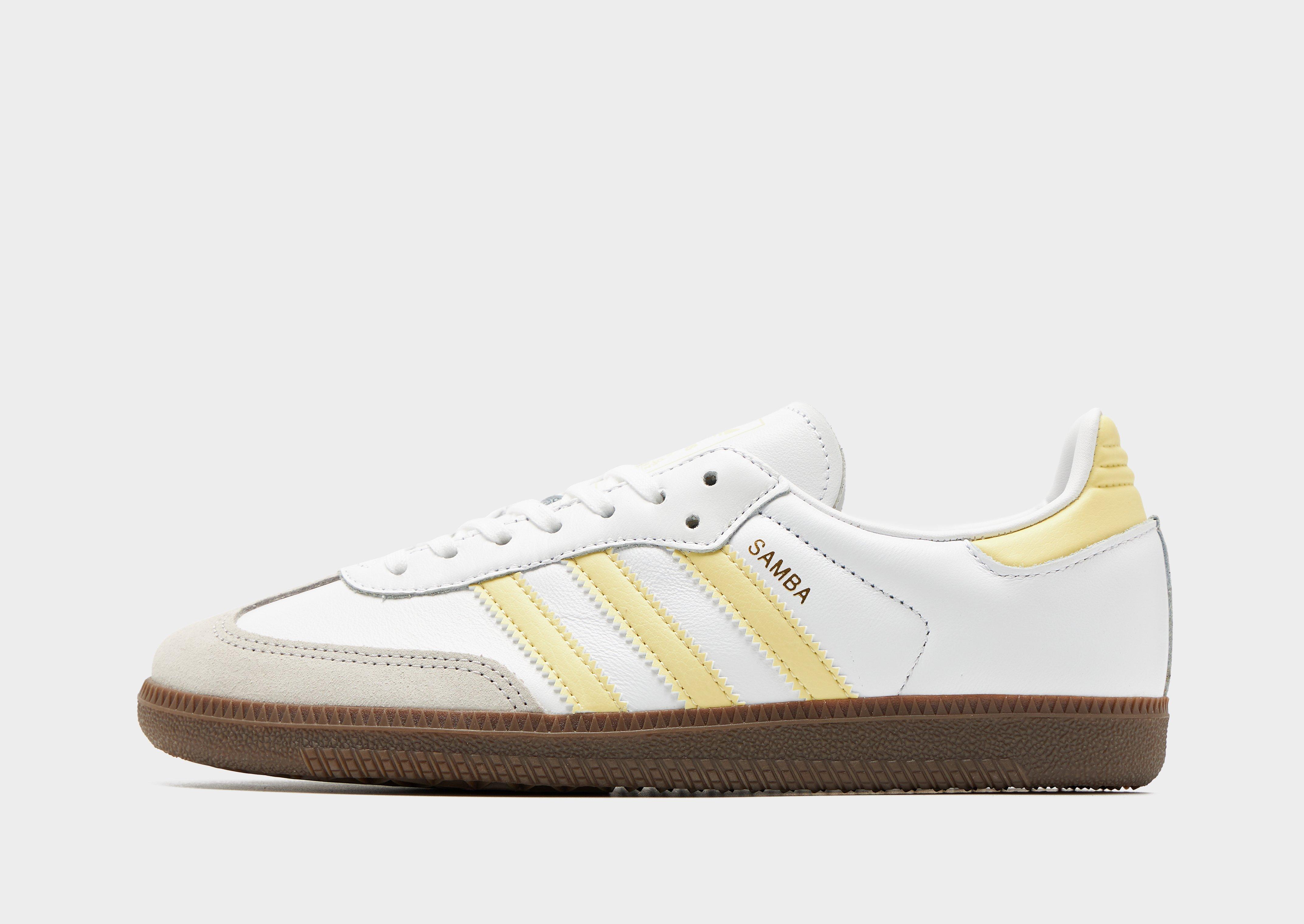 Add a streetwear icon to your footwear rotation with these junior's Samba OG shoes from adidas Originals, exclusive to JD. Taking cues from the original football-inspired Samba design first introduced in the 1950s, these iconic terrace sneakers let you imagine you're walking in those vintage footsteps. Built with a White leather upper, they feature a suede toe guard and are sat upon a responsive gum midsole. With tonal laces and signature adi 3-stripes to the side in Yellow, they're signed off with 'Samba' wording to the side, and iconic Trefoil branding to the tongue. Style Code: JR3127