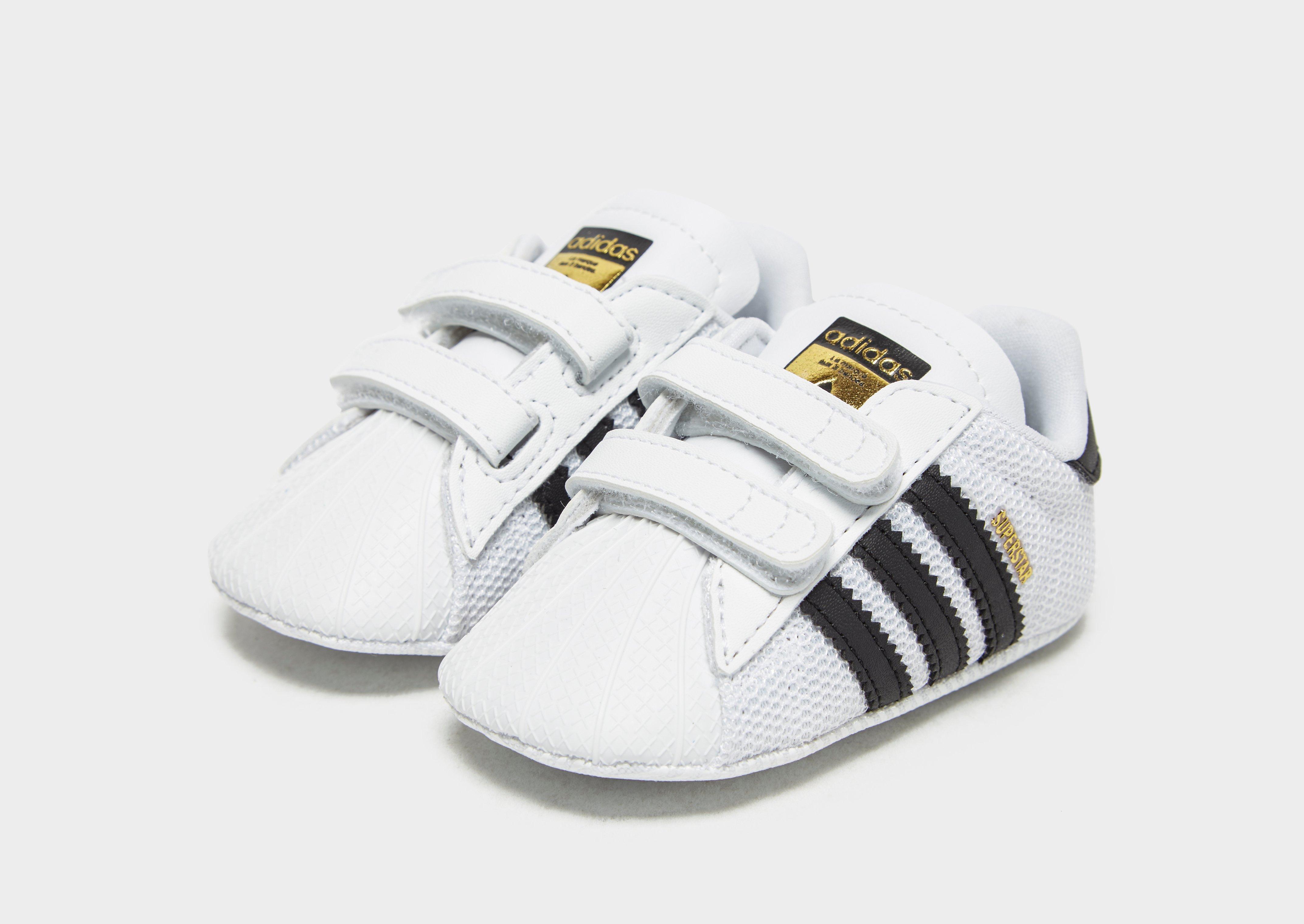 Let even the smallest of sneakerheads get in on the style that's defined the streets for decades. These children's Superstar Crib trainers by adidas originals, are a pint-sized take on the basketball icon. In a white and black colourway they are built with a perforated leather for breathable, comfortable wear and the legendary rubber shell toe for added swagger. Sat on a rubber cupsole for grippy traction wherever they go, finished with the iconic 3-Stripes to the sides.