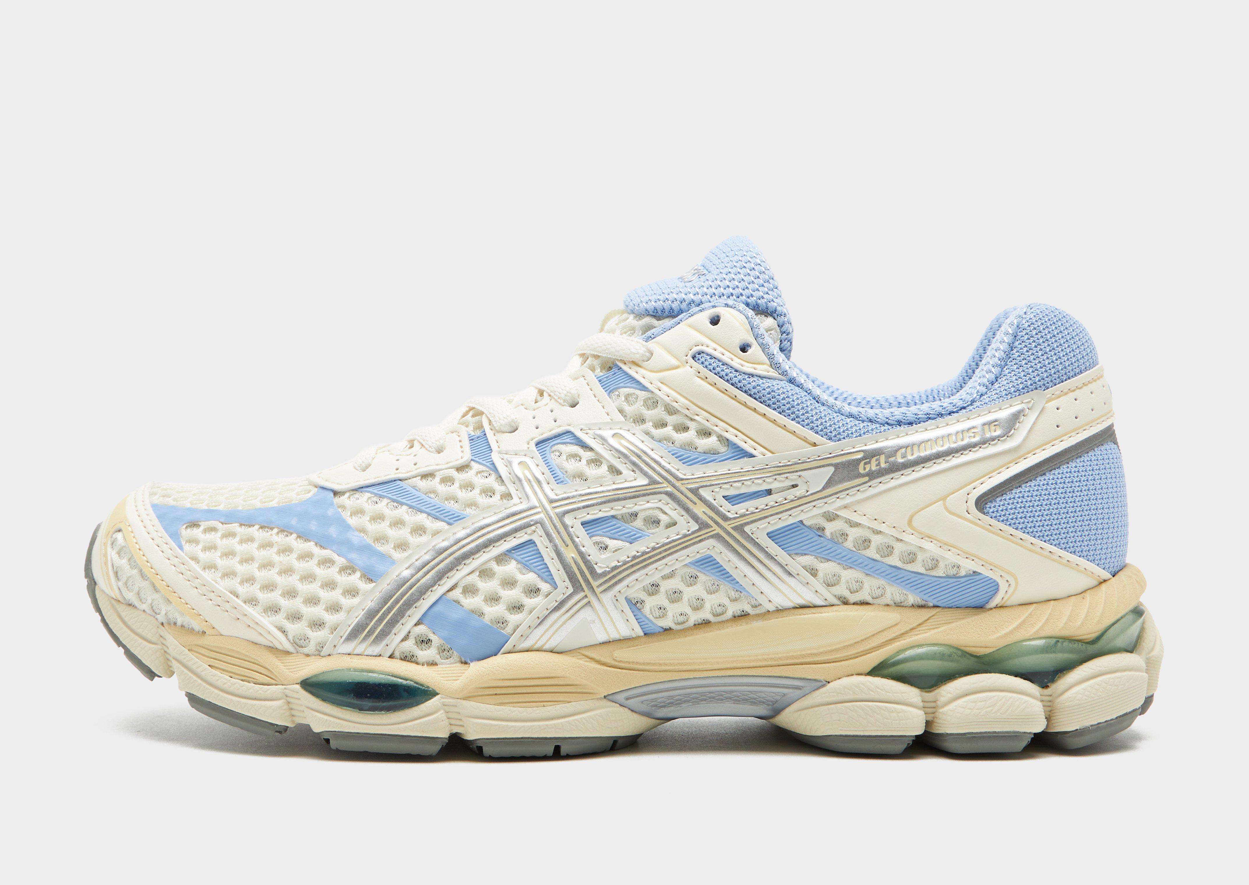 Lace up in tech-style with these women's GEL-CUMULUS 16 shoes from ASICS. In a Cream colourway with Blue details, these low-profile sneakers have glossy synthetic leather overlays, no-sew panelling, and open mesh underlays for a supportive feel. Underfoot features a foam midsole paired with GEL technology for enhanced cushioning and a rubber outsole for superior traction. Signed off with ASICS branding throughout.