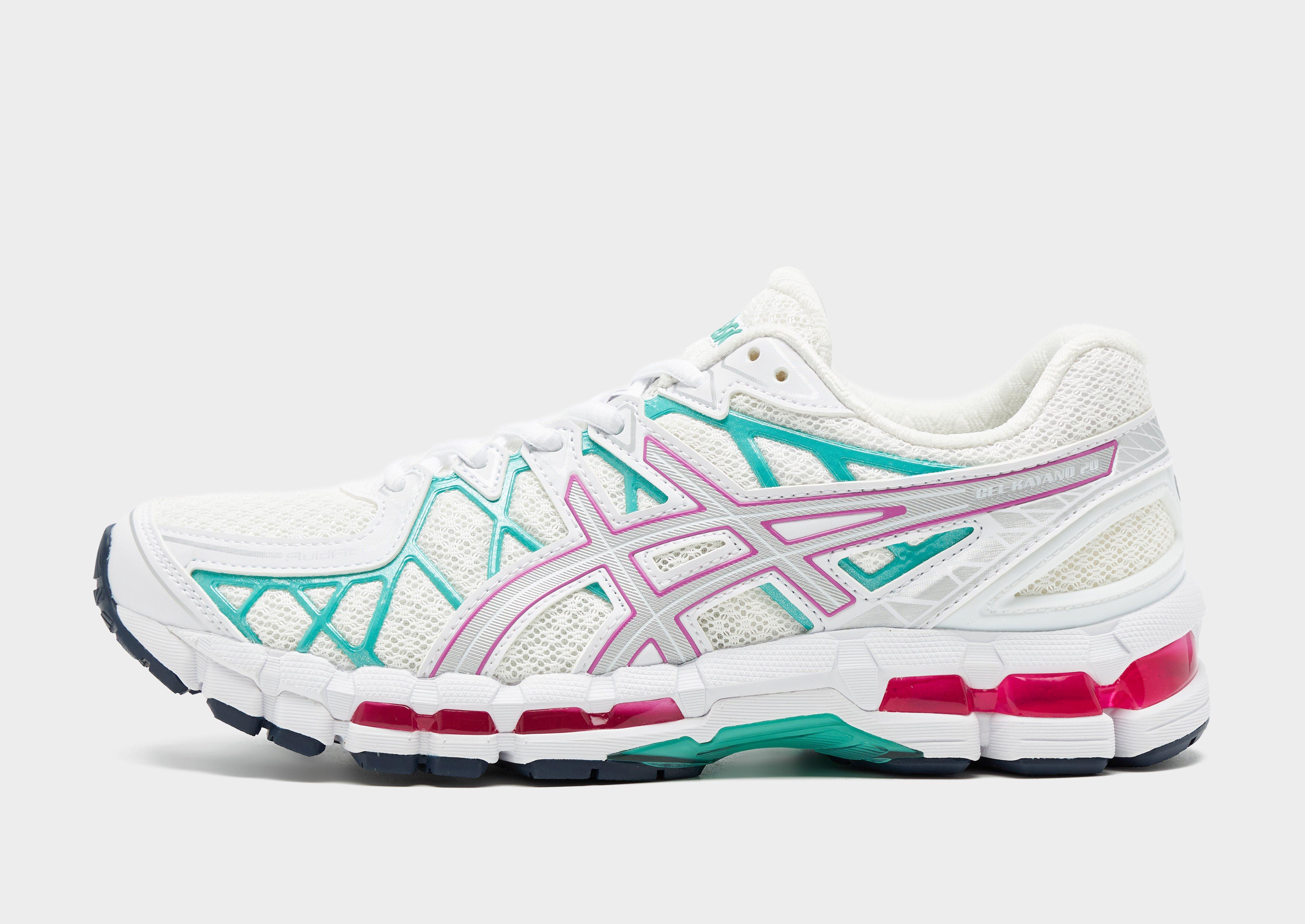 Step into retro running heritage with these women's ASICS Gel-Kayano 20 trainers. Dressed in white with green and pink accents, they bring early 2010s performance style to contemporary streetwear. The legendary GEL cushioning system delivers superior shock absorption with every step. Built with premium materials and iconic ASICS branding, these kicks celebrate classic running innovation with nostalgic appeal. Perfect for sneaker fans who appreciate vintage running design with modern wearability. Style Code: 1203A388.105W