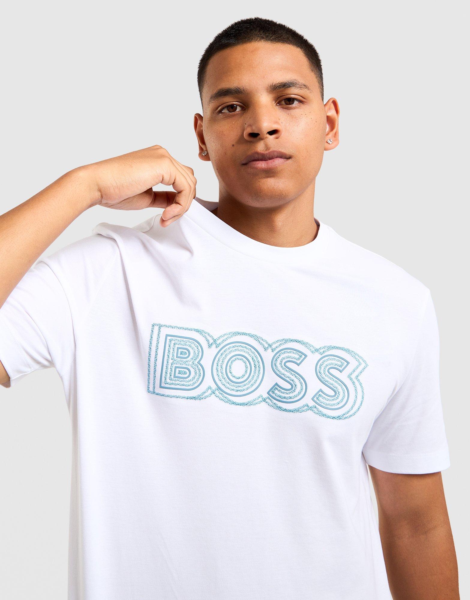 Stand out with this men's Boss tee featuring high brand read 3D outline graphics for bold visual impact. Standard fit and short sleeves deliver everyday comfort with a premium edge. White colourway with light blue detailing keeps your look clean and contemporary. Soft cotton fabric ensures breathability whether you're working out or hanging out. Boss craftsmanship meets statement-making design.