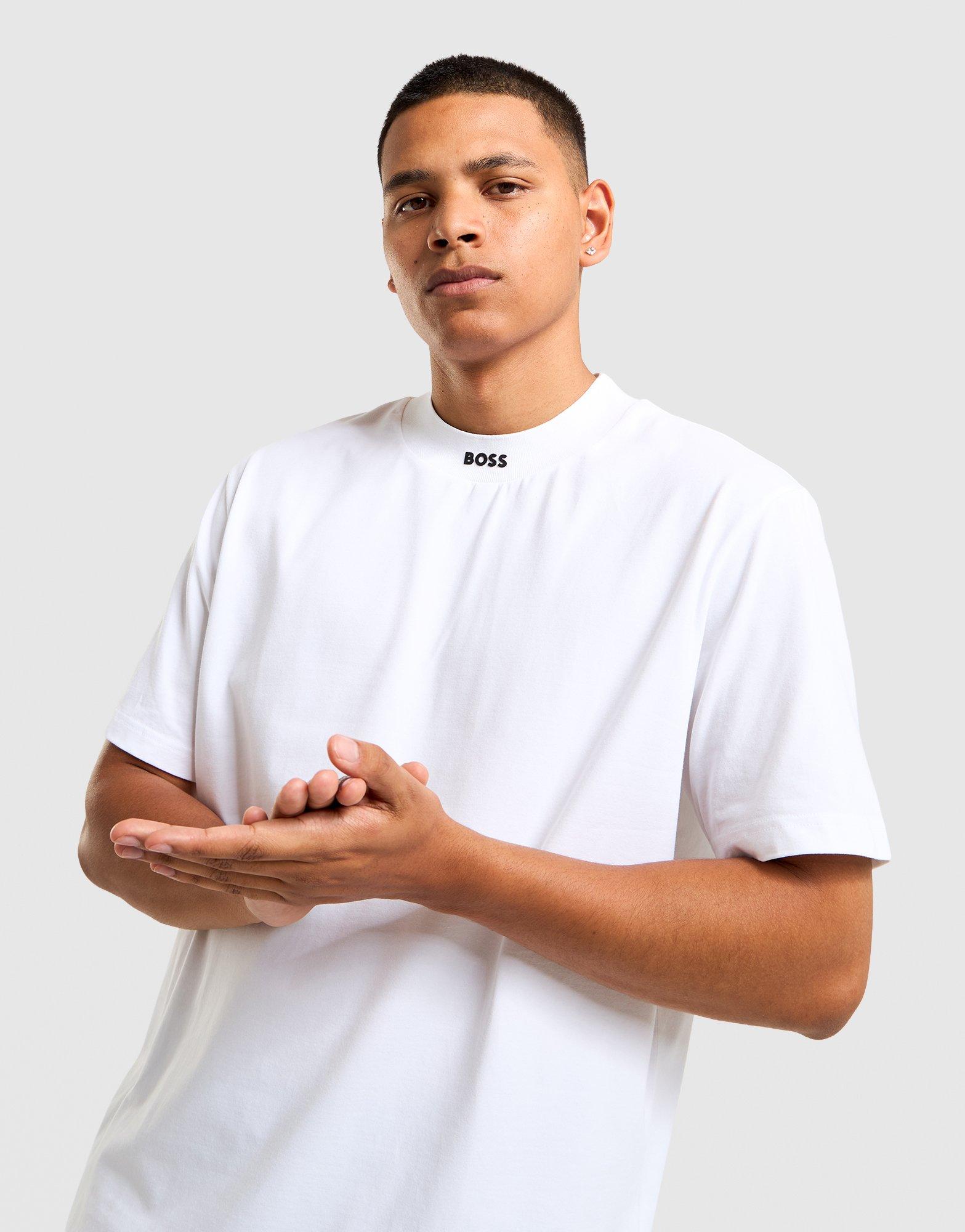 Nail understated style with this men's Boss tee featuring low brand read collar detailing for subtle sophistication. Standard fit and short sleeves offer versatile comfort that works for any occasion. White colourway with black accents creates a crisp, timeless look that pairs with anything. Premium cotton construction delivers softness and durability you can count on. Minimalist Boss design for the modern wardrobe.