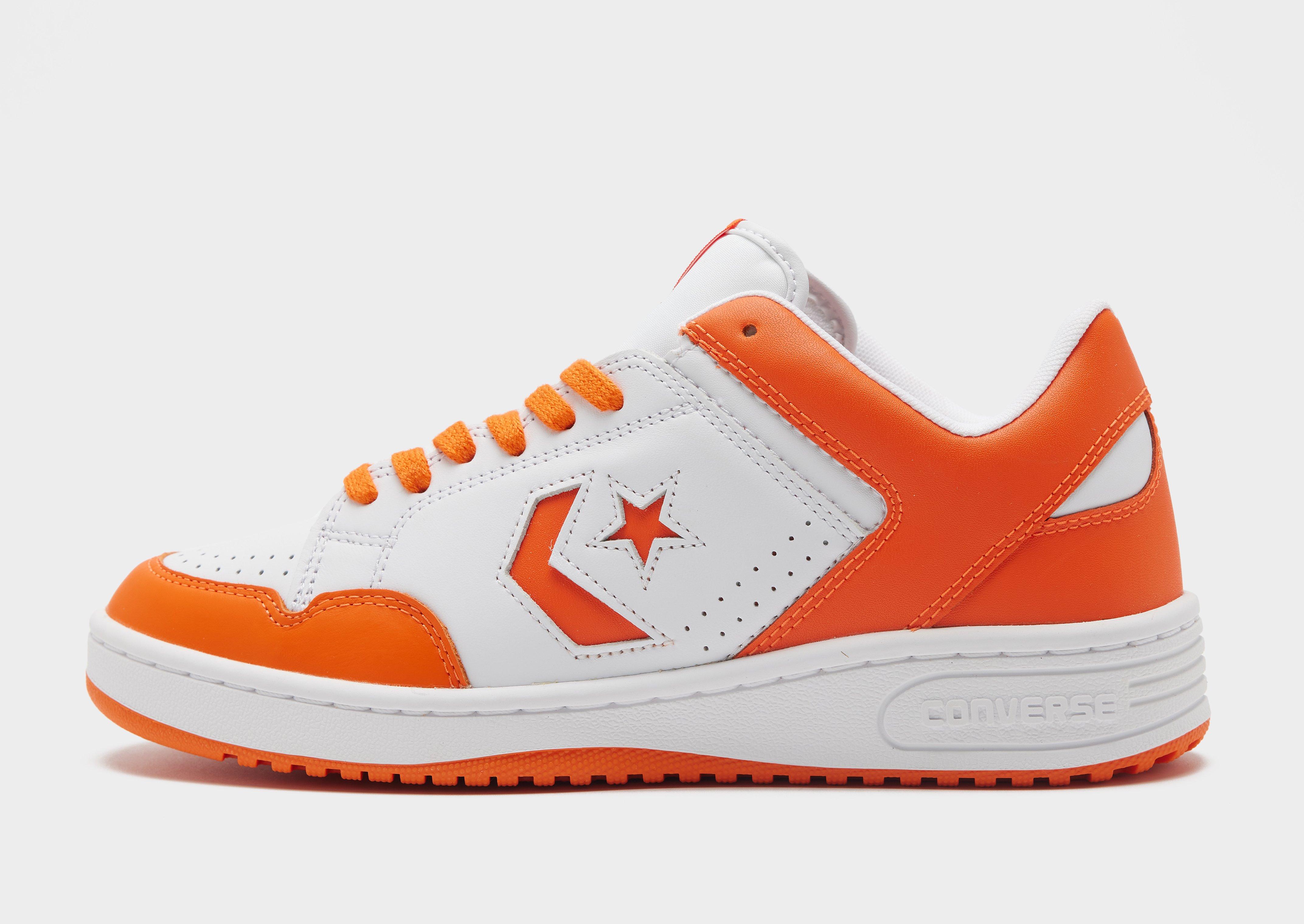 Add an old-school, retro shoe to your kick rotation with this men's Weapon sneaker from Converse. Landing in a White colourway with Orange details, these JD-exclusive sneakers pay homage to basketball and skate shoes from the '90s. Made with durable leather and nubuck upper, with PU cushioning that provides next-level comfort. Finished with a woven All Star tongue label to rep' the legacy. Style Code: A12868