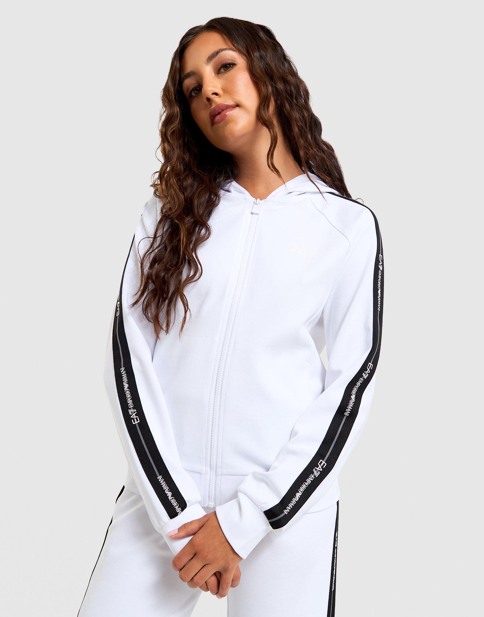 Stay sharp and comfortable in this women's Ea7 full-zip hoodie that balances athletic function with everyday style. Standard fit and long sleeves with ribbed cuffs ensure a flattering, secure silhouette. White colourway with black logo tape creates a fresh, sporty contrast that stands out. Full-zip closure offers easy on-off convenience for layering across seasons. Premium Ea7 construction for women who refuse to compromise on quality.