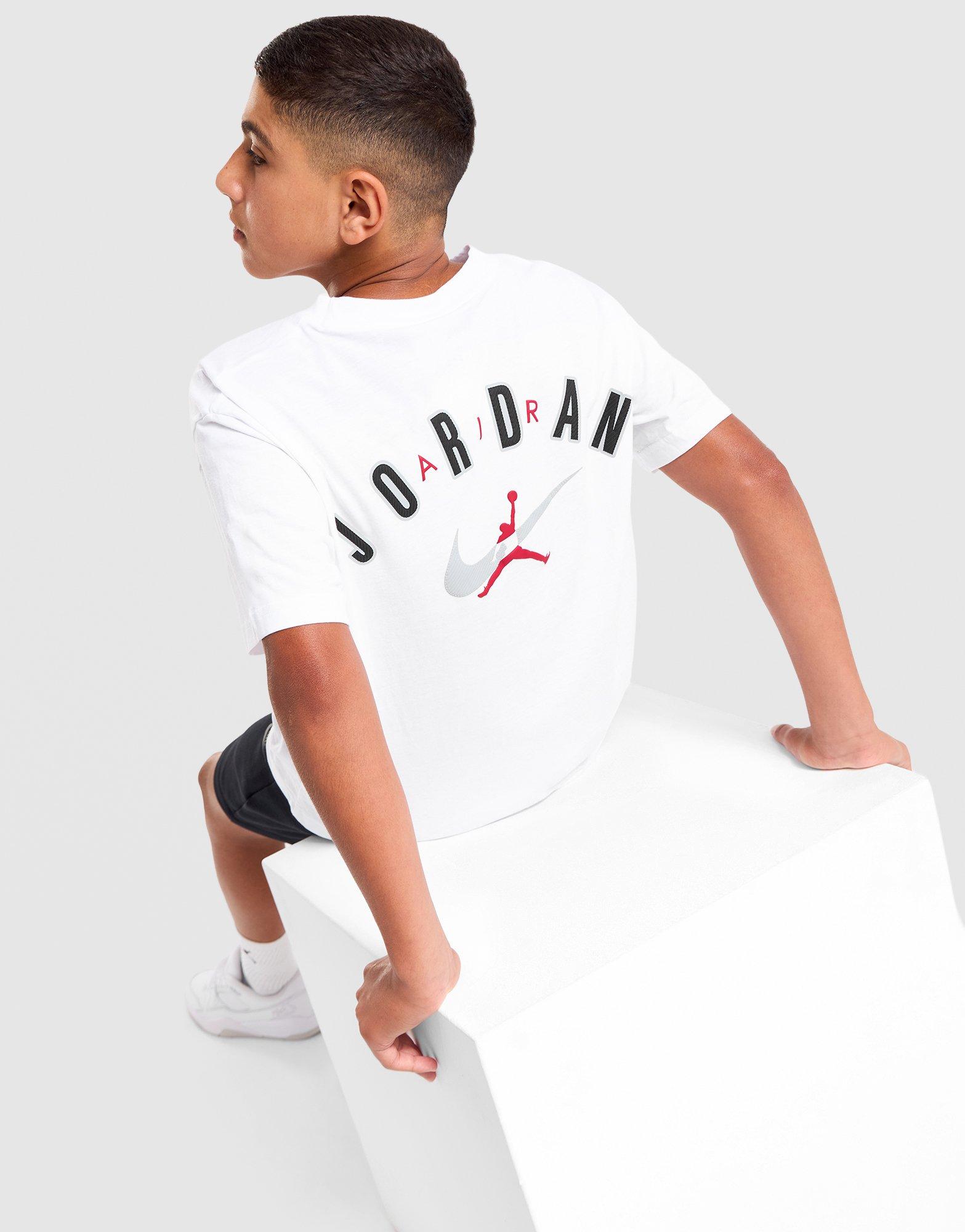 Gear up your junior wardrobe with this Jordan Arch Jordan T-Shirt, exclusive to JD for authentic Jordan style. The standard fit offers easy, everyday comfort, while the iconic arch branding brings that signature basketball-inspired look. Styled in a clean white colourway with red and grey detailing, it's a must-have for young sneakerheads and Jordan fans. This short-sleeve tee is perfect for pairing with shorts, joggers, or their favourite kicks. Style Code: 95F690-001