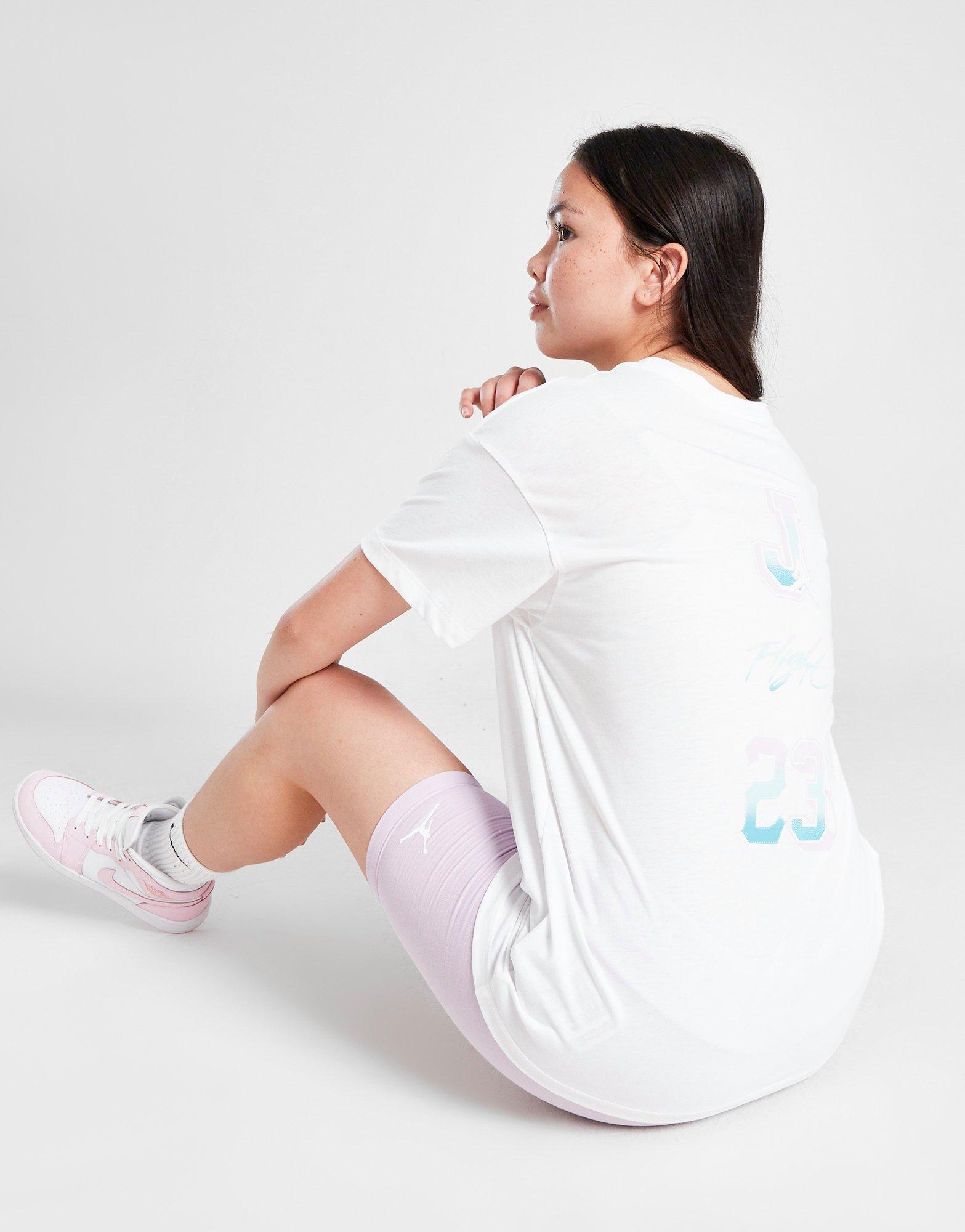 Pull on JD-exclusive style with this junior girls' Fade Back Graphic T-Shirt from Jordan. In a White colourway, this tee is cut from soft cotton fabric for lasting comfort. It features a ribbed crew neckline and short sleeves for a classic cut, and is signed off with Jordan wordmark and the signature Jumpman logo to the chest, with Jordan Flight branding on the back. Machine washable.
