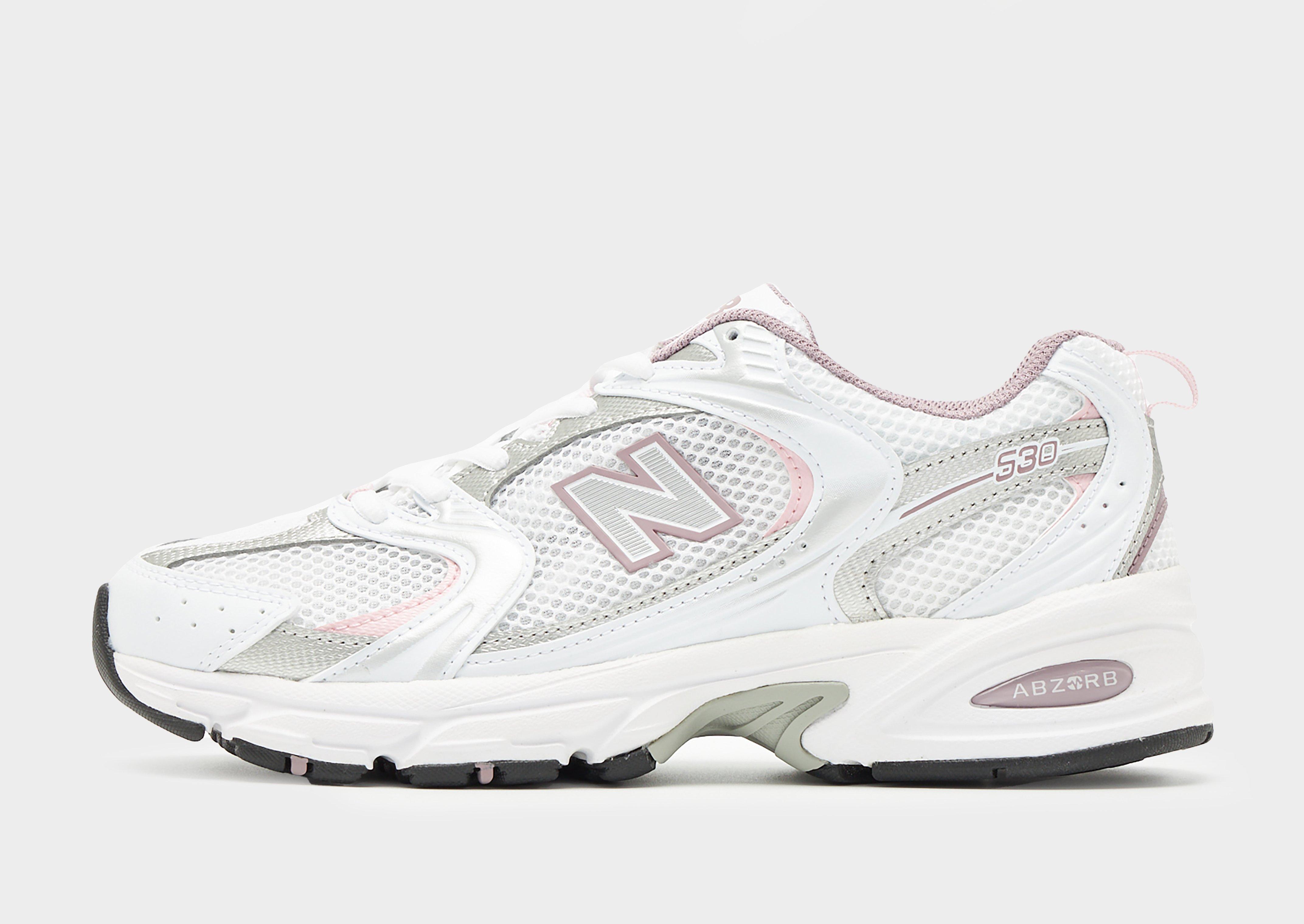 Level up your off-duty rotation with these women's 530 trainers from New Balance. Bringin' an old-school running silhouette to your game, these lightweight sneaks have a White upper with Pink and Silver accents. With a tonal lace-up fastening and plush ankle collar for step-in comfort, they're sat on a flared midsole for everyday cushioning. With a bold rubber outsole that runs up the heel, these kicks are finished off with an oversized 'N' logo to the sidewall and New Balance branding to the tongue.