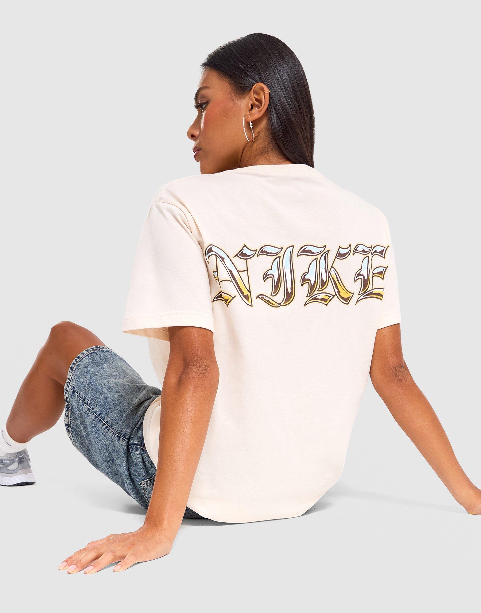 Make a statement with this women's Nike Oversized Chrome Graphic T-Shirt. Featuring an oversized fit and short sleeves, it showcases bold chrome graphics on both the front and back in off-white with metallic accents. The relaxed silhouette delivers on-trend streetwear style that pairs effortlessly with joggers, jeans, or biker shorts. Built with premium construction and eye-catching graphic detailing, this tee brings contemporary edge to casual wardrobes. Finished with Nike branding for authentic sportswear appeal. Style Code: IH7702-103