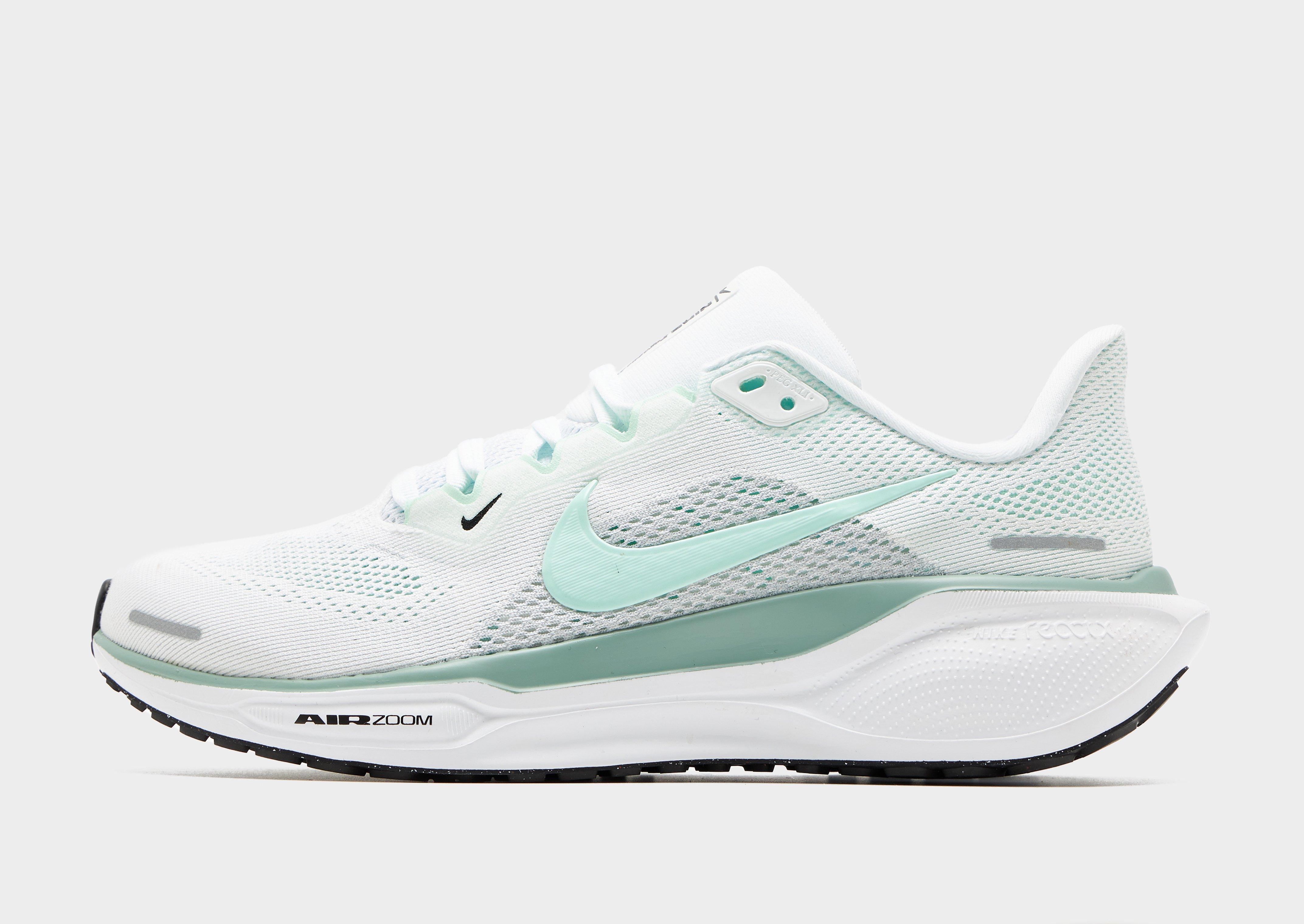 Get moving with these women's Pegasus 41 running shoes from Nike. Landing in a White colourway with Mint Green details, these runners have a breathable mesh upper to keep your feet cool when you're striding for PBs. They feature a lace fastening to secure the fit, and a low-cut padded ankle collar to keep you feeling snug. Underfoot, a partly recycled ReactX foam midsole works with dual Air Zoom units to provide responsive cushioning, while the rubber outsole ensures you're gripped to the surface. Perfect for those beginning their running journey, experts, or for everyday wear. Signed off with the Swoosh to the sidewalls. Style Code: FD2723-113