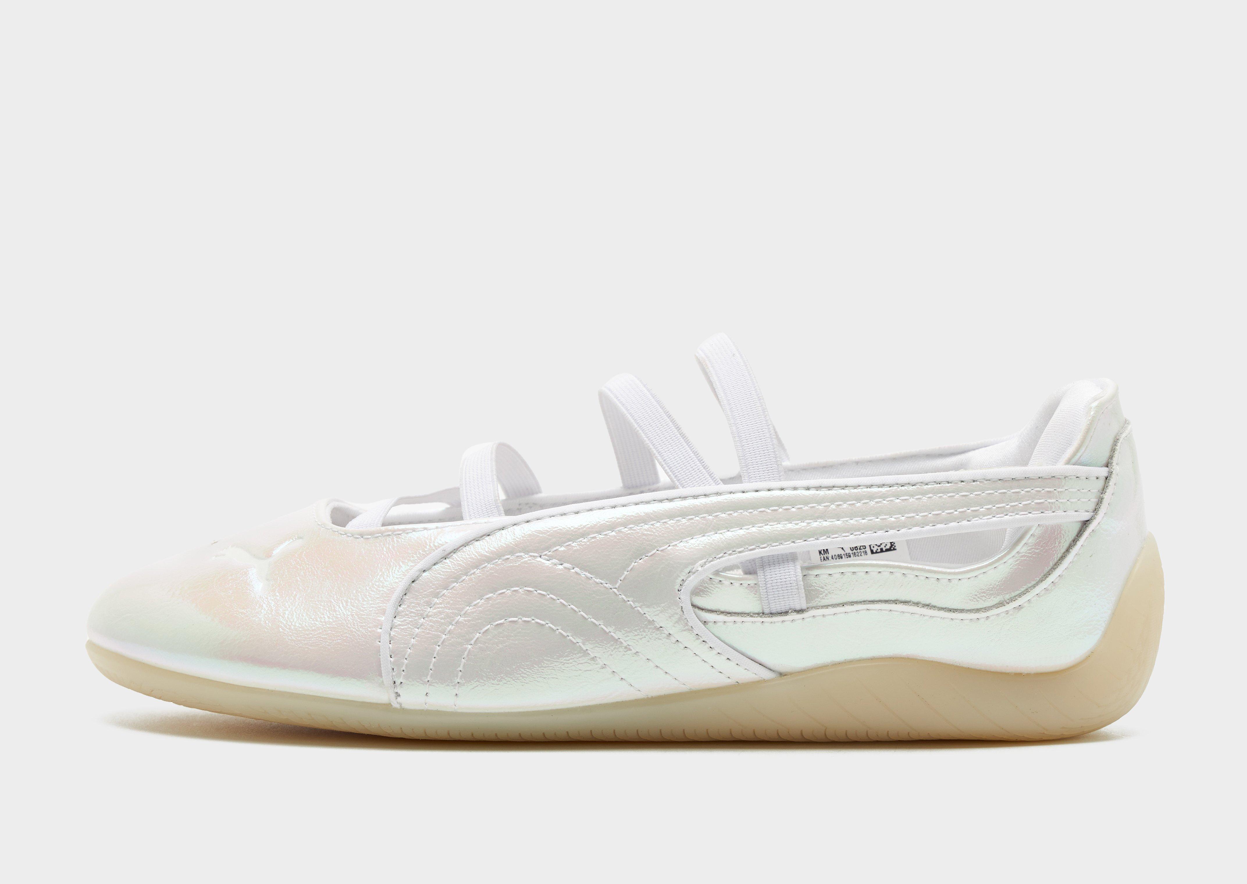 The iconic Speedcat sneaker returns in a low-profile form with the women's Speedcat Ballet from Puma. Landing in a Pearlized colourway details, its low profile silhouette is paired with sleek details inspired by motorsport racing. This 'sneakerina' combines the sporty sole and comfort of a sneaker with the delicate upper of a ballet flat. The shoe's popularity has taken it from motor racing to the fashion world, with its vibrant colours and easy to wear design making it a must-have staple for your sneaker rotation. Crafted from a Suede upper for an elevated look, a rubber outsole underneath provides traction, and rubber bands over the foot for a locked-in feel. Finished off with the signature PUMA formstrip to the sidewalls, and the iconic PUMA silhouette embroidered to the toebox.