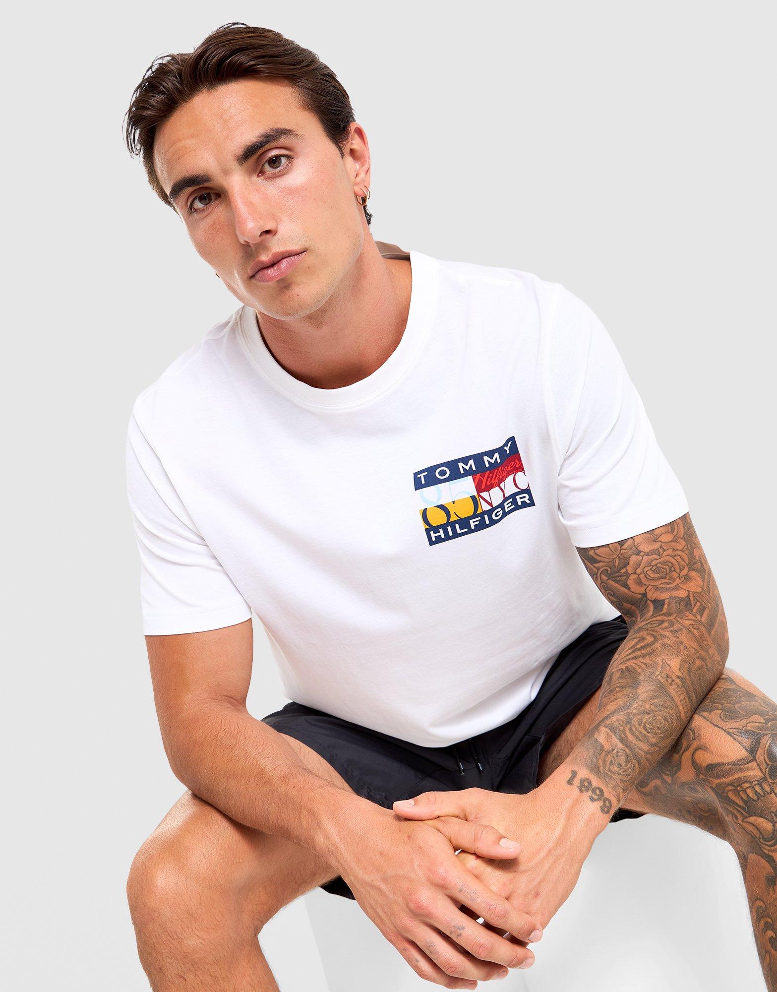 The men’s Tommy Hilfiger Flag Box T‑Shirt in white delivers classic styling with modern graphics. Cotton-blend fabric and standard fit provide everyday comfort. A versatile piece for casual and streetwear outfits.