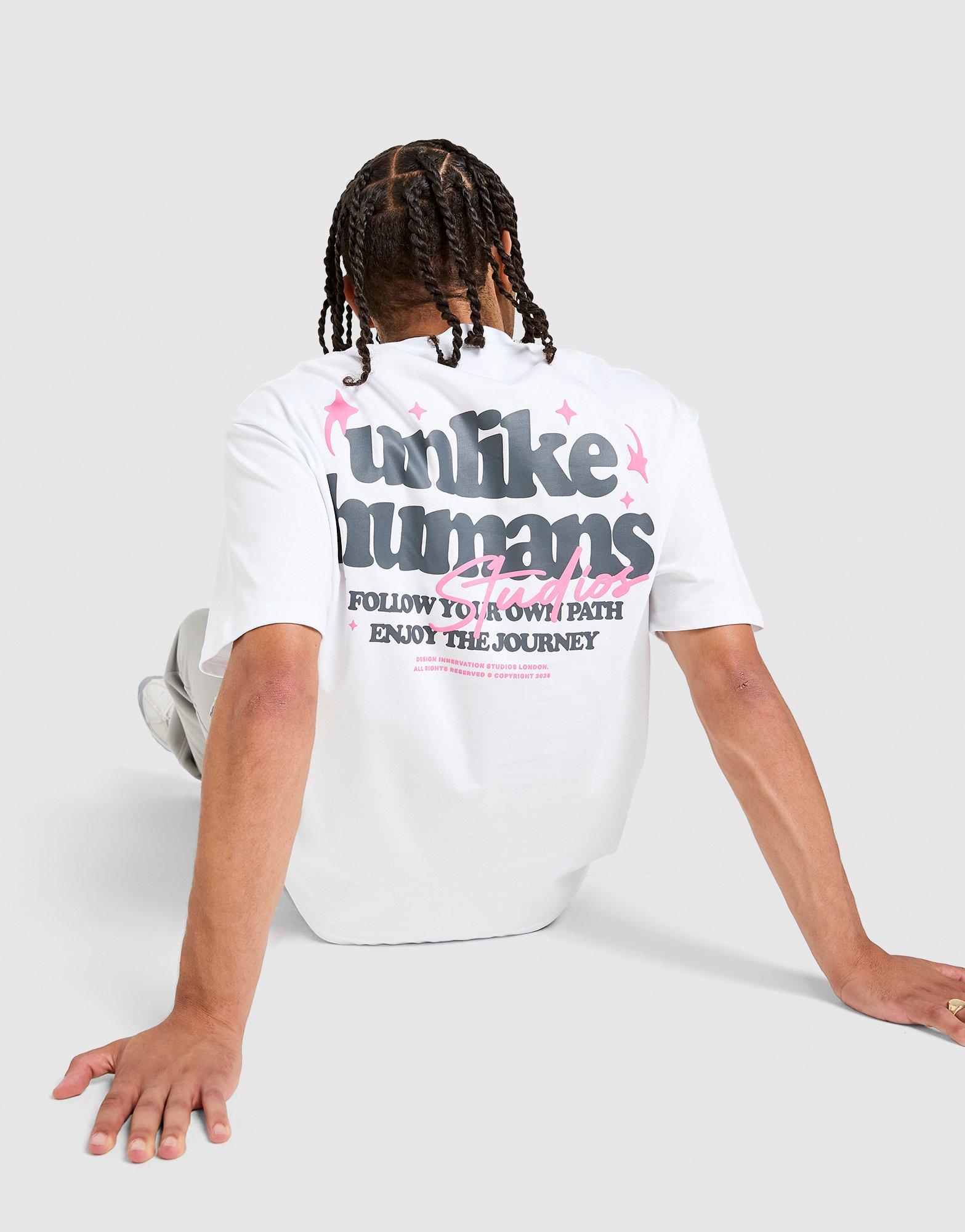 Laidback looks in Unlike Humans. This men's Crafted T-Shirt has a slightly loose fit for a chilled feel. Soft white cotton, crew neck, short sleeves. All bases covered. Finished with a bold Unlike Humans back graphic and a logo up front. Machine washable. | Our model is 6'0" with a 41" chest and wears a size M.