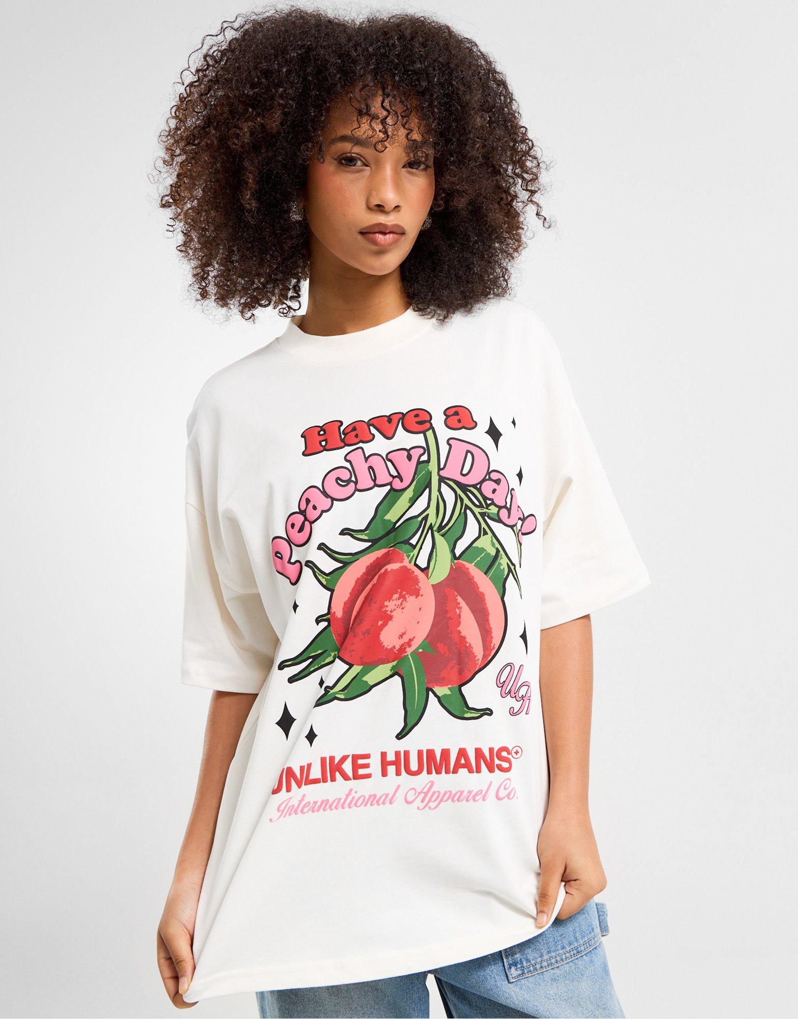 Up your street-style game with this women's Peach Graphic T-Shirt from Unlike Humans. Embrace the inbetween and your individuality with streetwear brand Unlike Humans.