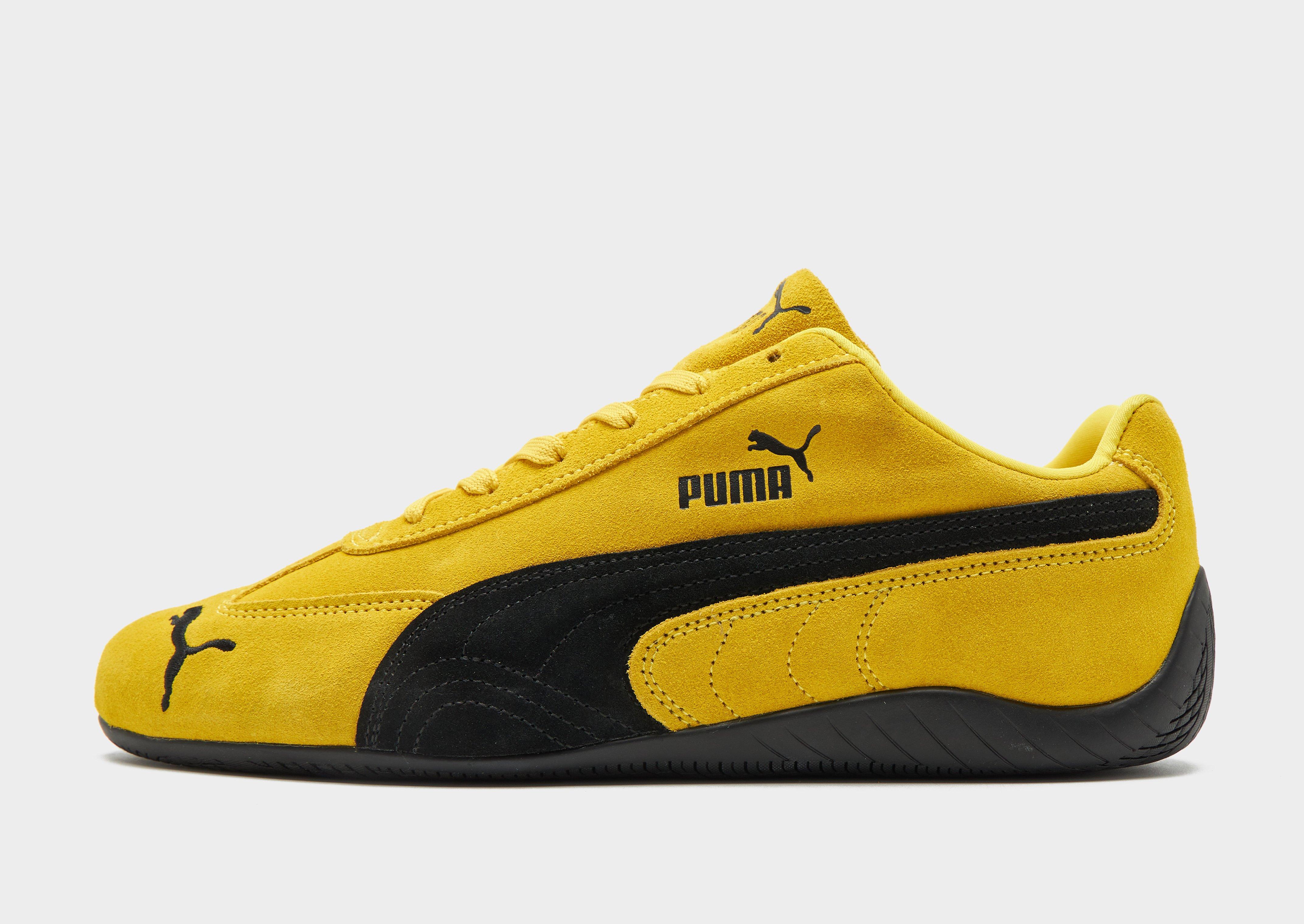 The iconic silhouette returns with the men's Speedcat OG sneaker from Puma. Landing in a Yellow colourway with Black details, this low profile silhouette is paired with sleek details inspired by motorsport racing. The shoe's popularity has taken it from motor racing to the fashion world, with its vibrant colours and easy to wear design making it a must-have staple for your sneaker rotation. Crafted from a leather upper for an elevated look, a rubber outsole underneath provides traction. Finished off with the signature PUMA formstrip to the and gold foil branding to the sidewalls, and the iconic PUMA silhouette embroidered to the toebox. Style Code: 39884619